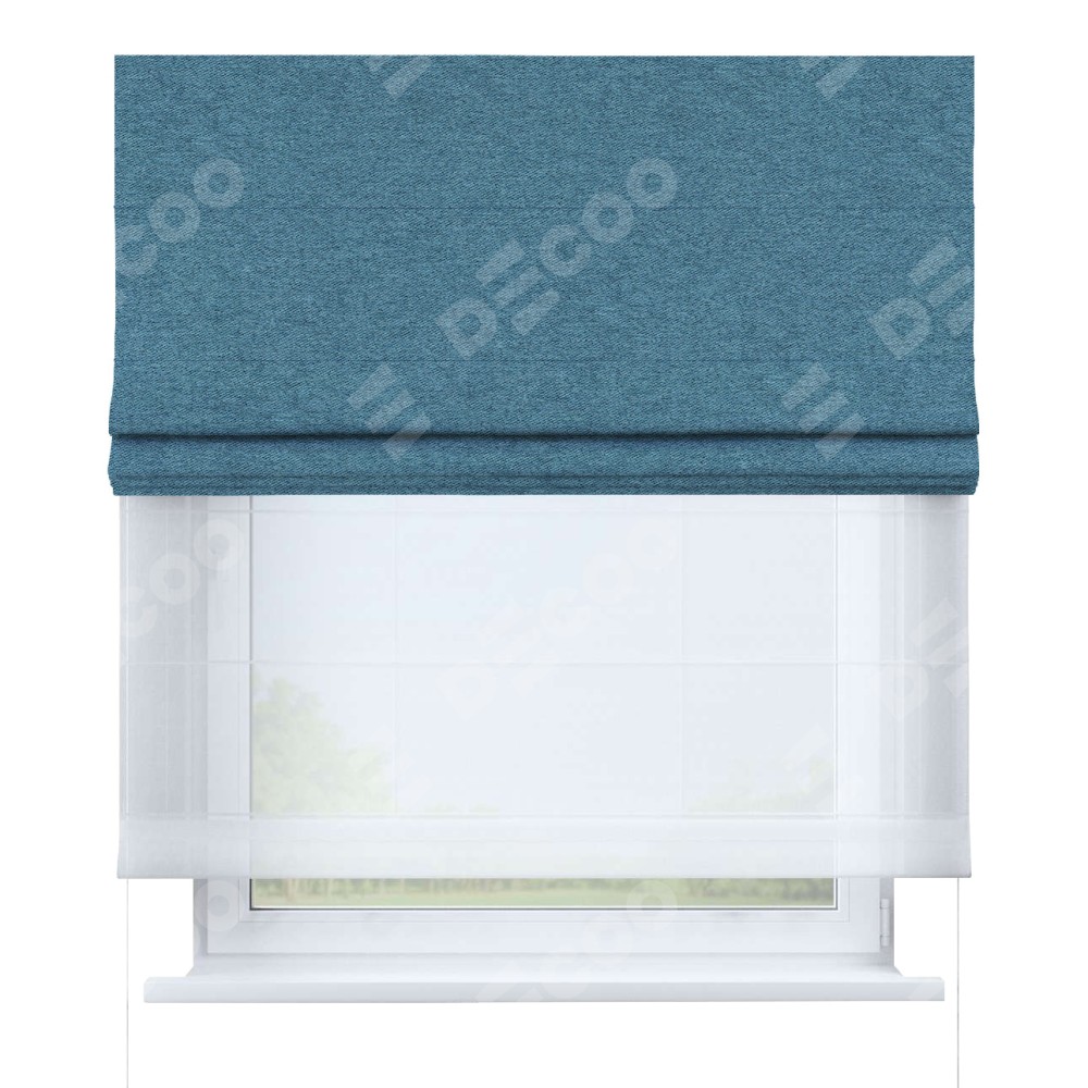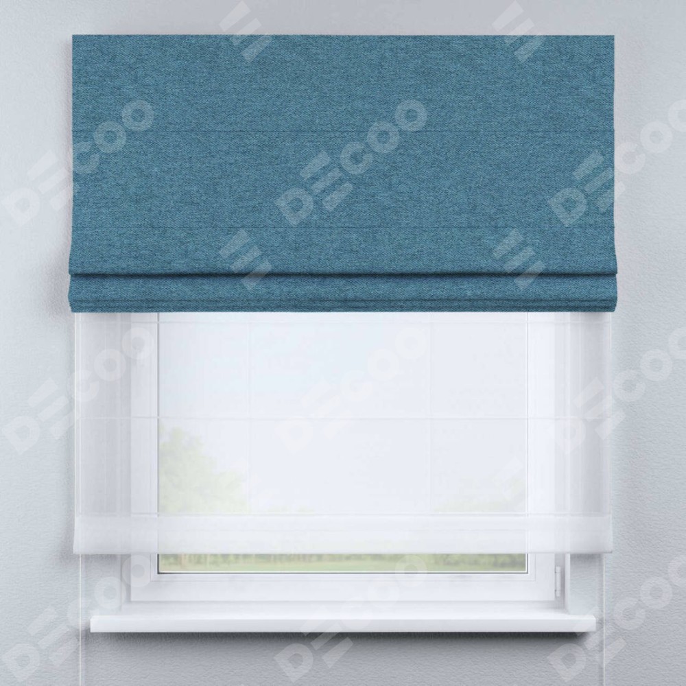 Римская штора день-ночь производителя «Cortin», используется для проёма, пошита из двух полотен, с лицевой стороны твид блэкаут светло-синий артикул 90935, вторая ткань тюль (по стандарту комплектуется тюль белого цвета артикул V-01). Имеет универсальный механизм и подходит для монтажа: на потолок, на стену и в нишу.