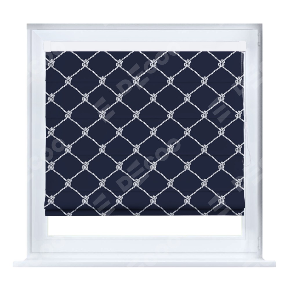 Римская штора кассетного типа, производителя «Cortin», устанавливается только на пластиковые окна и прилегает к стеклопакету, пошита из ткани блэкаут с нанесением сублимационной печати «Морские веревки».