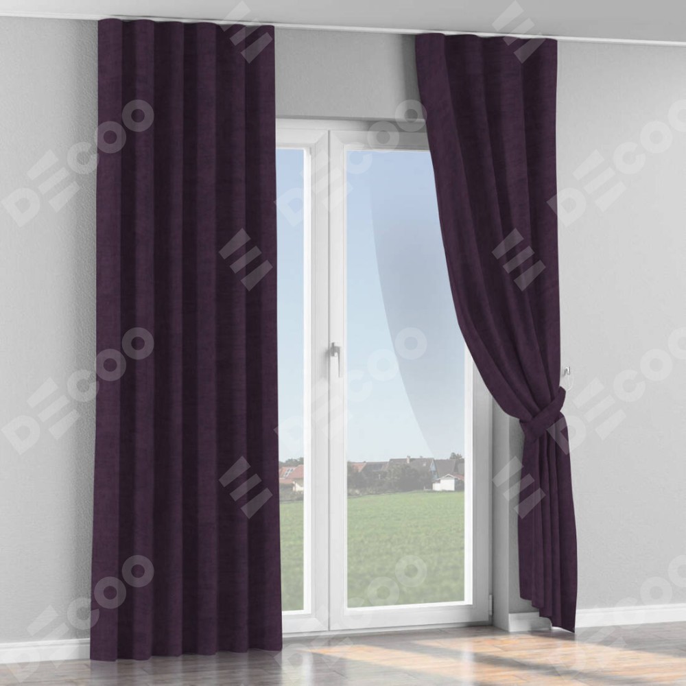 Комплект прямых штор, от производителя «Cortin», пошиты из ткани вельвет тёмно-фиолетовый, артикул ткани 72403. С изнаночной стороны в верхней части штор пристрачивается шторная лента с декоративными складками «Волна». Для создания элегантных складок прямые шторы шьются по стандарту с коэффициентом 1:2 (на 100 см. ширины проёма 200 см. ширины ткани).