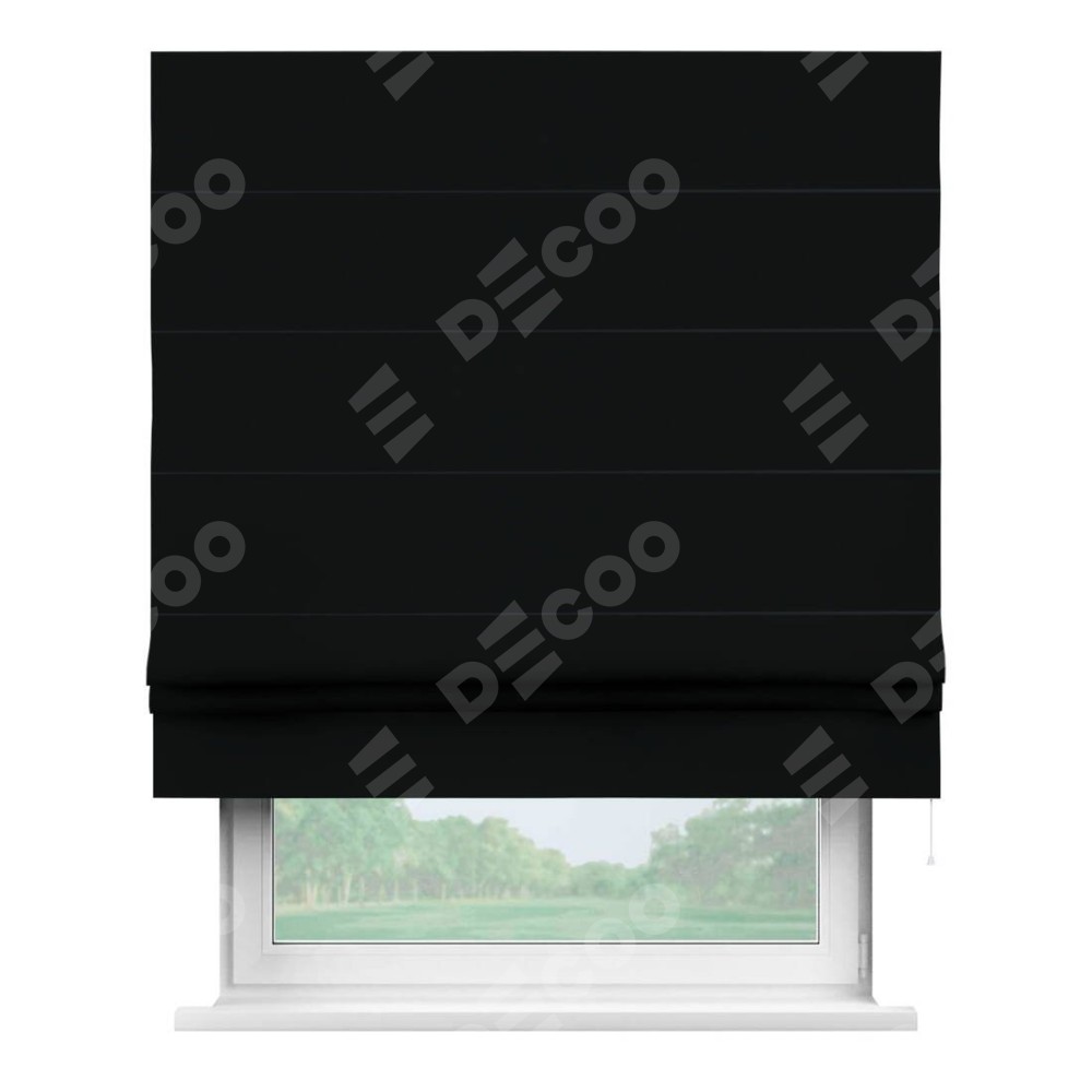 Римская штора производителя «Cortin», используется для проёма, пошита из ткани блэкаут однотонный черный, артикул ткани 91571−2. Имеет универсальный механизм и подходит для монтажа: на потолок, на стену и в нишу.