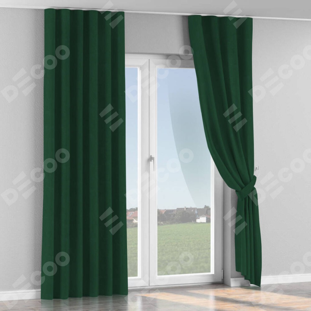 Комплект прямых штор, от производителя «Cortin», пошиты из ткани блэкаут однотонный зелёный, артикул ткани 91572−2. С изнаночной стороны в верхней части штор пристрачивается шторная лента с декоративными складками «Волна». Для создания элегантных складок прямые шторы шьются по стандарту с коэффициентом 1:2 (на 100 см. ширины проёма 200 см. ширины ткани).