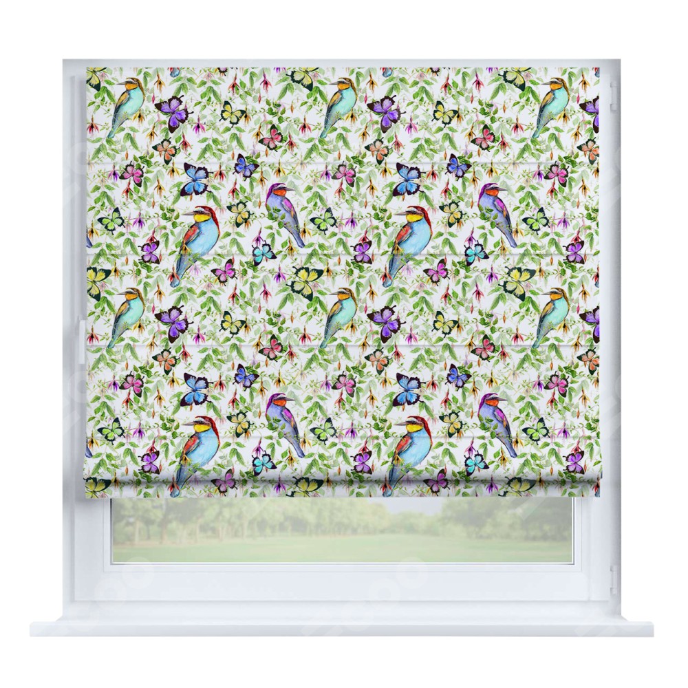 Римская штора производителя «Cortin», устанавливается на створку окна, пошита из ткани блэкаут с нанесением сублимационной печати «Тропические птицы». Штора шьётся по индивидуальным размерам, для данного типа римской шторы возможная ширина от 35 до 150 см., высота до 250 см.