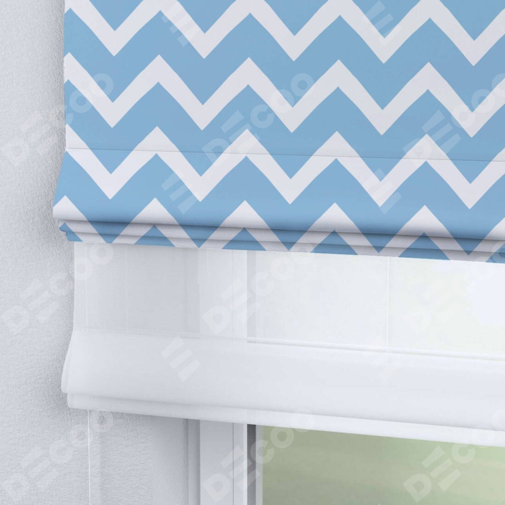 Римская штора день-ночь производителя «Cortin», используется для проёма, пошита из двух полотен, с лицевой блэкаут с нанесением сублимационной печати «Зигзаг средний», вторая ткань тюль (по стандарту комплектуется тюль белого цвета артикул V-01). Имеет универсальный механизм и подходит для монтажа: на потолок, на стену и в нишу.