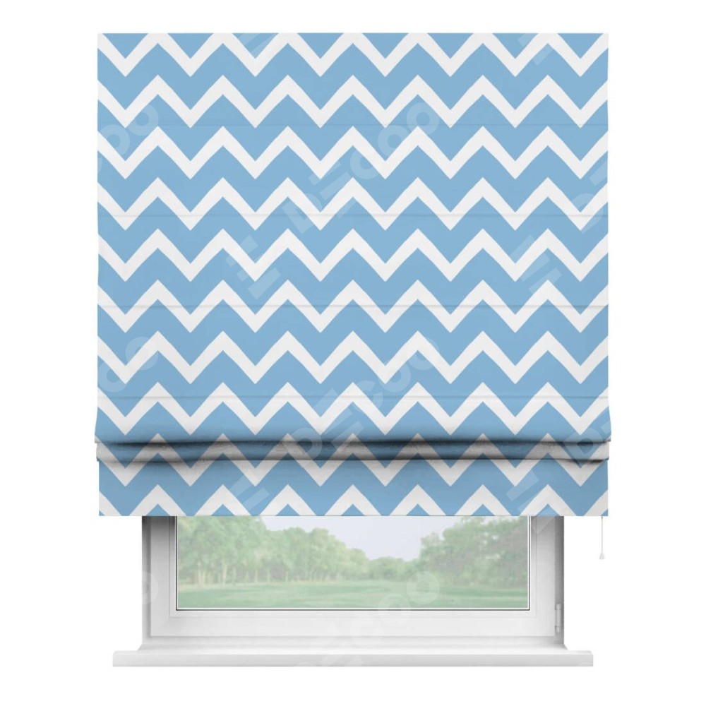 Римская штора производителя «Cortin», используется для проёма, пошита из ткани блэкаут с нанесением сублимационной печати «Зигзаг средний». Имеет универсальный механизм и подходит для монтажа: на потолок, на стену и в нишу.