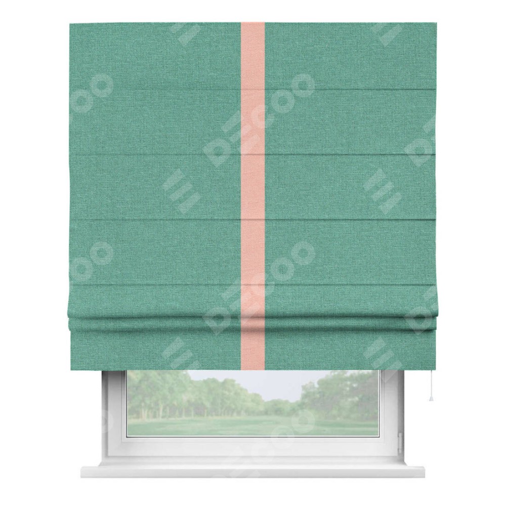 Римская штора производителя «Cortin», используется для проёма, пошита из ткани лён светло-бирюзовый, артикул 53435. Отделка шторы кантом «Хайвэй», ткань для канта используется из льна разной расцветки на выбор. Имеет универсальный механизм и подходит для монтажа: на потолок, на стену и в нишу.
