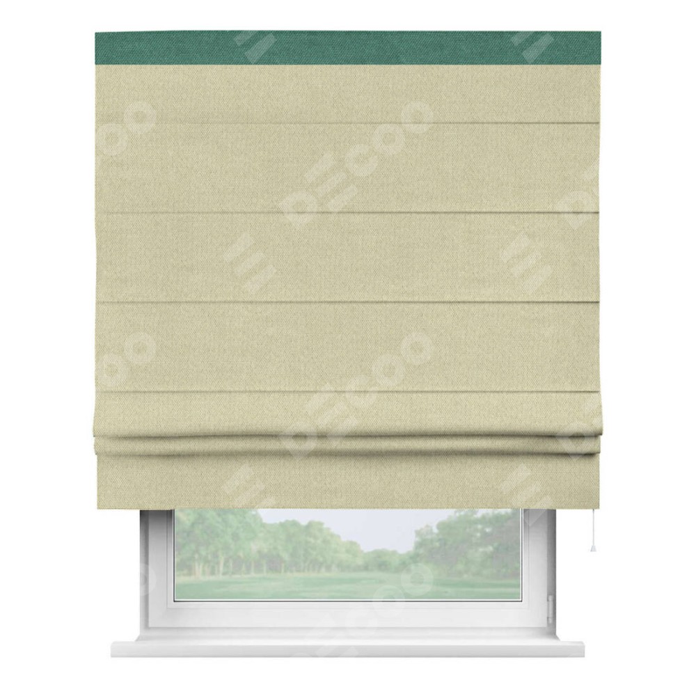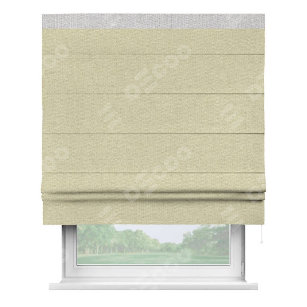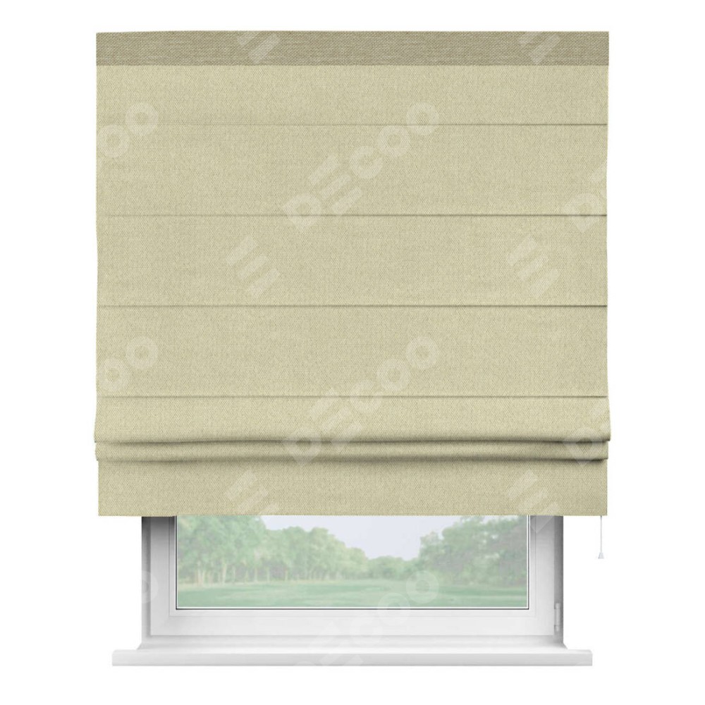 Римская штора производителя «Cortin», используется для проёма, пошита из ткани лён димаут шампань, артикул 90994. Отделка шторы кантом «Кинг», ткань для канта используется из льна димаут разной расцветки на выбор. Имеет универсальный механизм и подходит для монтажа: на потолок, на стену и в нишу.
