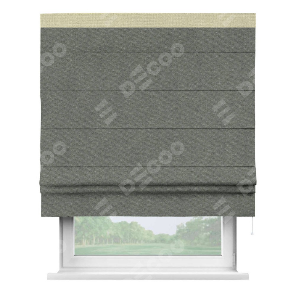 Римская штора производителя «Cortin», используется для проёма, пошита из ткани лён димаут тёмно-серый, артикул 91011. Отделка шторы кантом «Кинг», ткань для канта используется из льна димаут разной расцветки на выбор. Имеет универсальный механизм и подходит для монтажа: на потолок, на стену и в нишу.