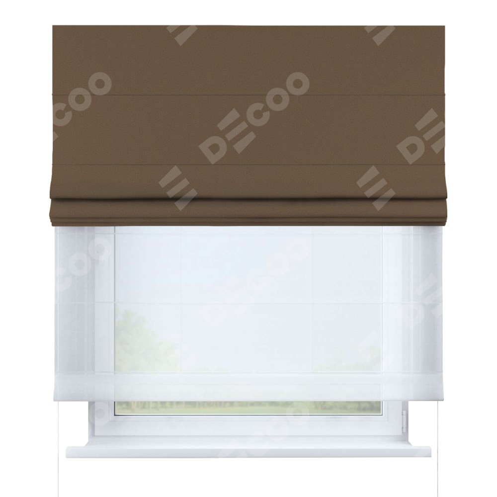Двойная римская штора «День-ночь» от производителя Cortin предназначена для использования в проёмах. Эта штора уникальна тем, что состоит из двух полотен. На лицевой стороне находится однотонный коричневый блэкаут (артикул: 91334), обеспечивающий эффективное затемнение. В комплект также входит вторая ткань — легкий белый тюль (артикул: V-01), который добавляет изящества и легкости оформлению окна. Кроме того, доступны и другие разновидности ткани тюль, выбор которых доступен по ссылке .