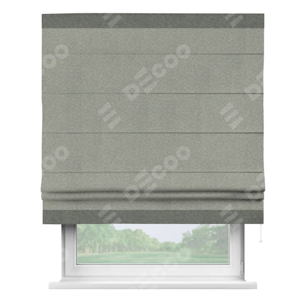 Римская штора производителя «Cortin», используется для проёма, пошита из ткани лён димаут серый, артикул 91009. Отделка шторы кантом «Горизонт», ткань для канта используется из льна димаут разной расцветки на выбор. Имеет универсальный механизм и подходит для монтажа: на потолок, на стену и в нишу.