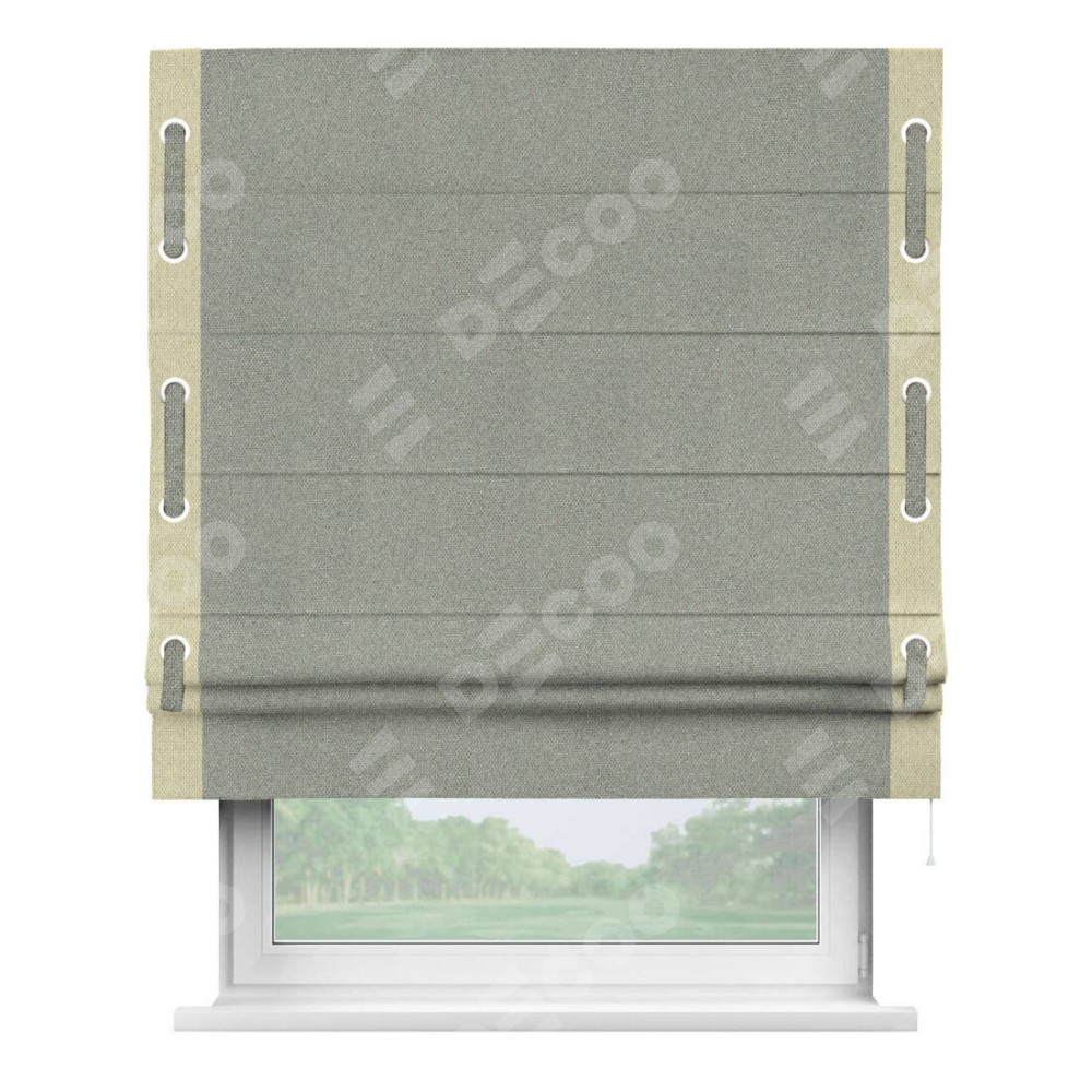Римская штора производителя «Cortin», используется для проёма, пошита из ткани лён димаут серый, артикул 91009. Отделка шторы кантом «Стрим Дуо» на кантах расположены люверсы с пояском, ткань для канта используется лён димаут разной расцветки на выбор. Ткань для пояска обычно используется из основной ткани шторы, а так же можно сделать из любой расцветки по желанию. Имеет универсальный механизм и подходит для монтажа: на потолок, на стену и в нишу.