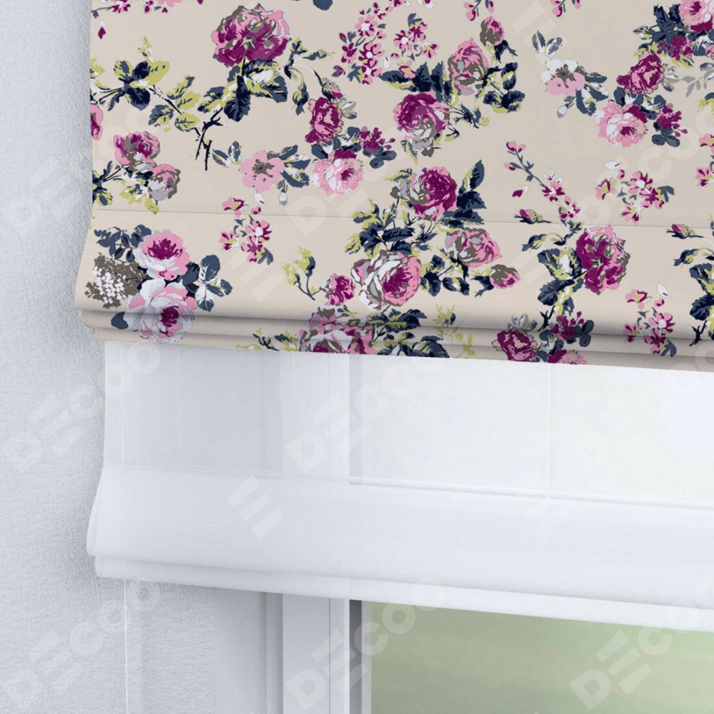Двойная римская штора «День-ночь» от производителя Cortin предназначена для использования в проёмах. Эта штора уникальна тем, что состоит из двух полотен. На лицевой стороне находится блэкаут с нанесением сублимационной печати «Россыпь розовых цветов», обеспечивающий эффективное затемнение. В комплект также входит вторая ткань — легкий белый тюль (артикул: V-01), который добавляет изящества и легкости оформлению окна. Кроме того, доступны и другие разновидности ткани тюль, выбор которых доступен по ссылке .