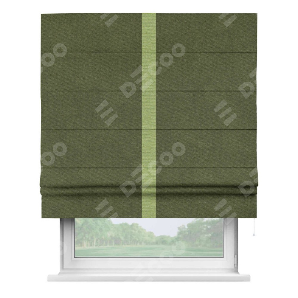 Римская штора производителя «Cortin», используется для проёма, пошита из ткани лён димаут салатовый, артикул 91002. Отделка шторы кантом «Хайвэй», ткань для канта используется из льна димаут разной расцветки на выбор. Имеет универсальный механизм и подходит для монтажа: на потолок, на стену и в нишу.