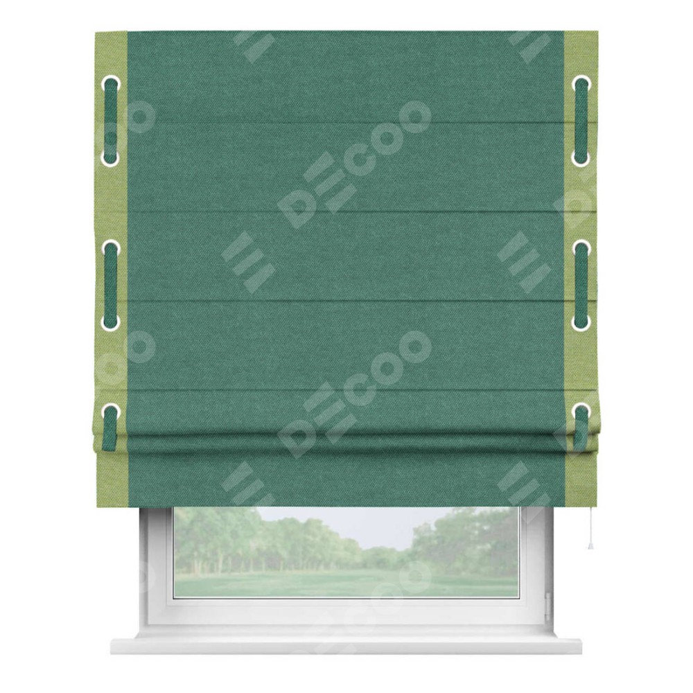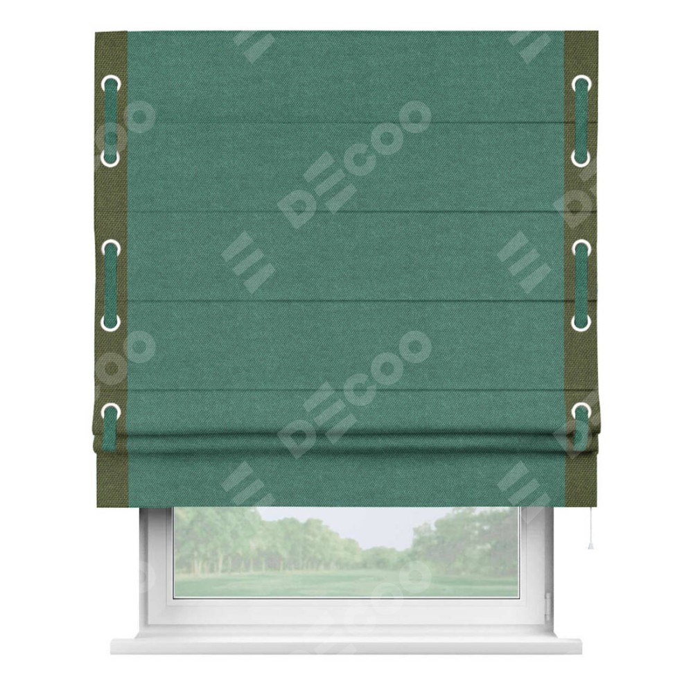 Римская штора производителя «Cortin», используется для проёма, пошита из ткани лён димаут светло-бирюзовый, артикул 91005. Отделка шторы кантом «Стрим Дуо» на кантах расположены люверсы с пояском, ткань для канта используется лён димаут разной расцветки на выбор. Ткань для пояска обычно используется из основной ткани шторы, а так же можно сделать из любой расцветки по желанию. Имеет универсальный механизм и подходит для монтажа: на потолок, на стену и в нишу.