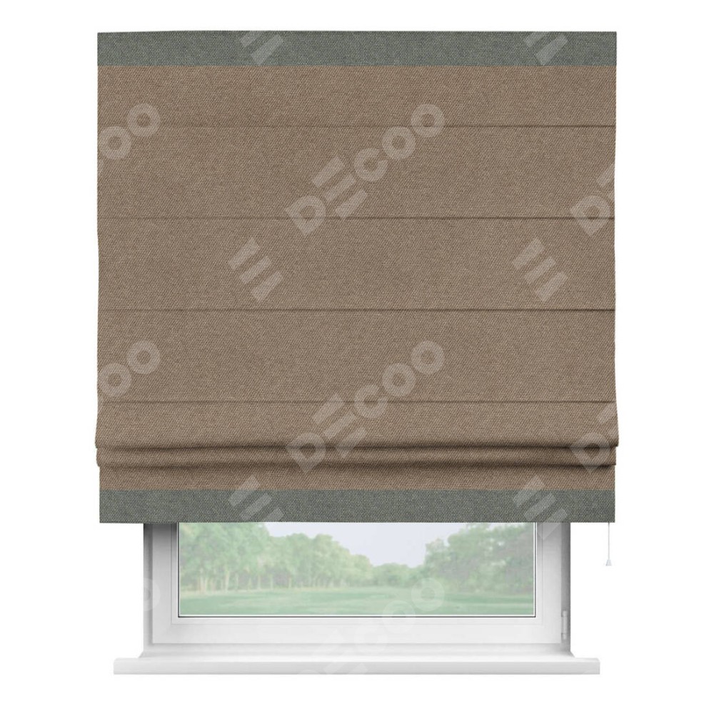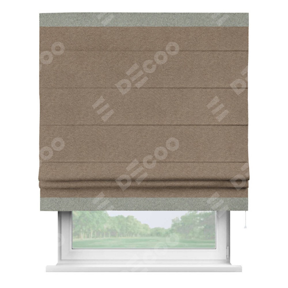 Римская штора производителя «Cortin», используется для проёма, пошита из ткани лён димаут коричневый, артикул 90996. Отделка шторы кантом «Горизонт», ткань для канта используется из льна димаут разной расцветки на выбор. Имеет универсальный механизм и подходит для монтажа: на потолок, на стену и в нишу.