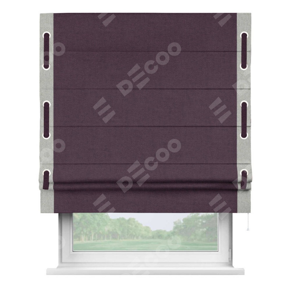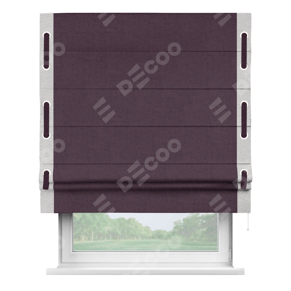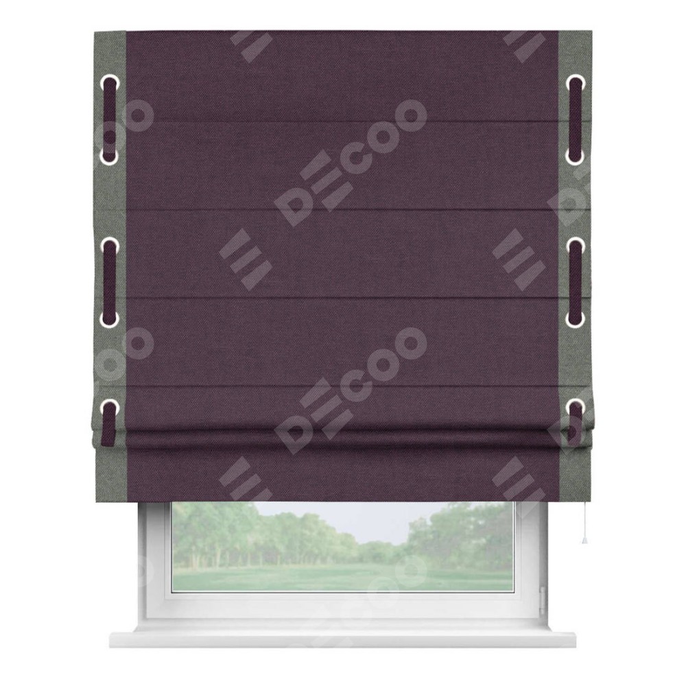 Римская штора производителя «Cortin», используется для проёма, пошита из ткани лён димаут фиолетовый, артикул 16267. Отделка шторы кантом «Стрим Дуо» на кантах расположены люверсы с пояском, ткань для канта используется лён димаут разной расцветки на выбор. Ткань для пояска обычно используется из основной ткани шторы, а так же можно сделать из любой расцветки по желанию. Имеет универсальный механизм и подходит для монтажа: на потолок, на стену и в нишу.
