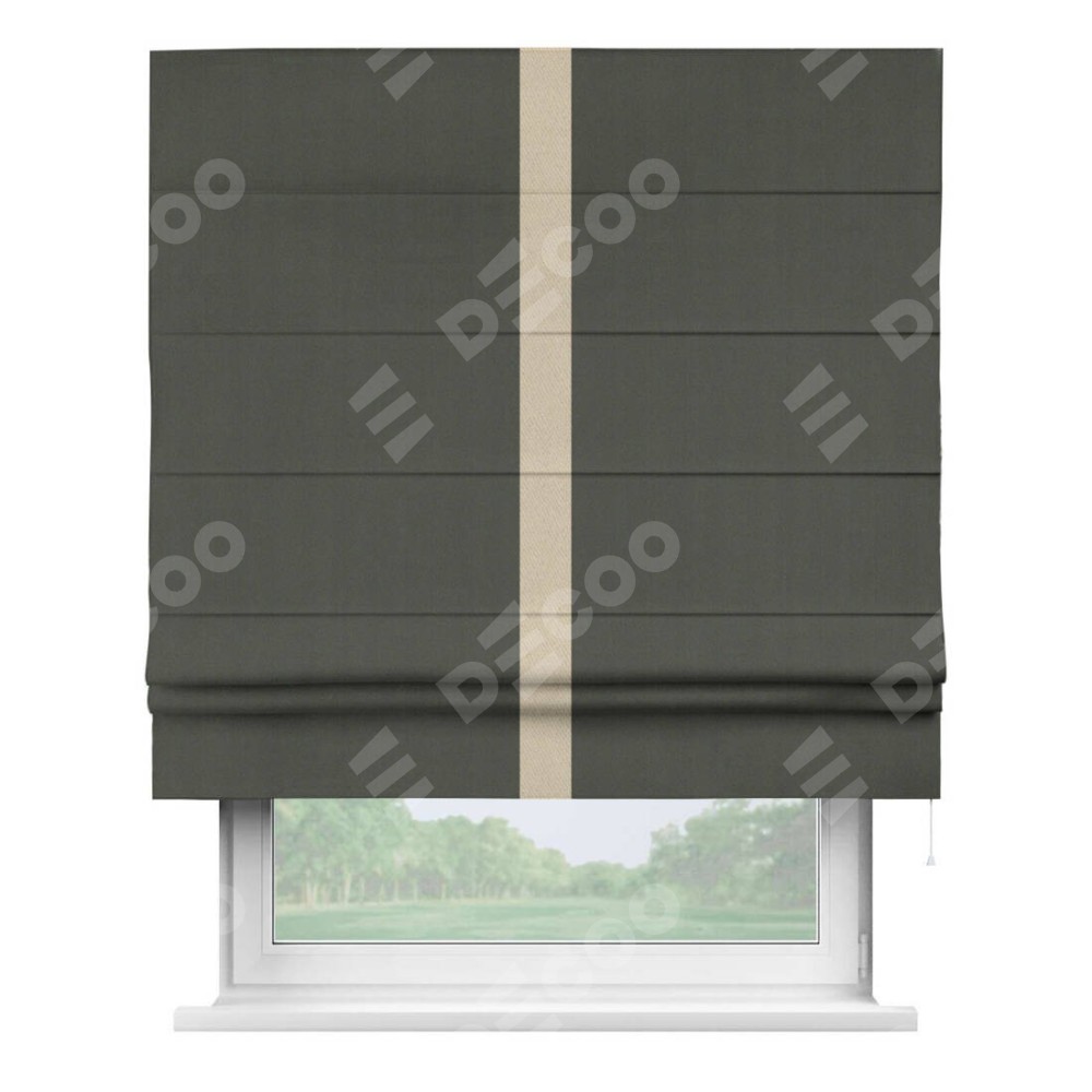 Римская штора производителя «Cortin», используется для проёма, пошита из ткани блэкаут однотонный дымчато-серый, артикул ткани 91571−1. Отделка шторы кантом «Хайвей», ткань для канта используется из блэкаута однотонного разной расцветки на выбор. Имеет универсальный механизм и подходит для монтажа: на потолок, на стену и в нишу.