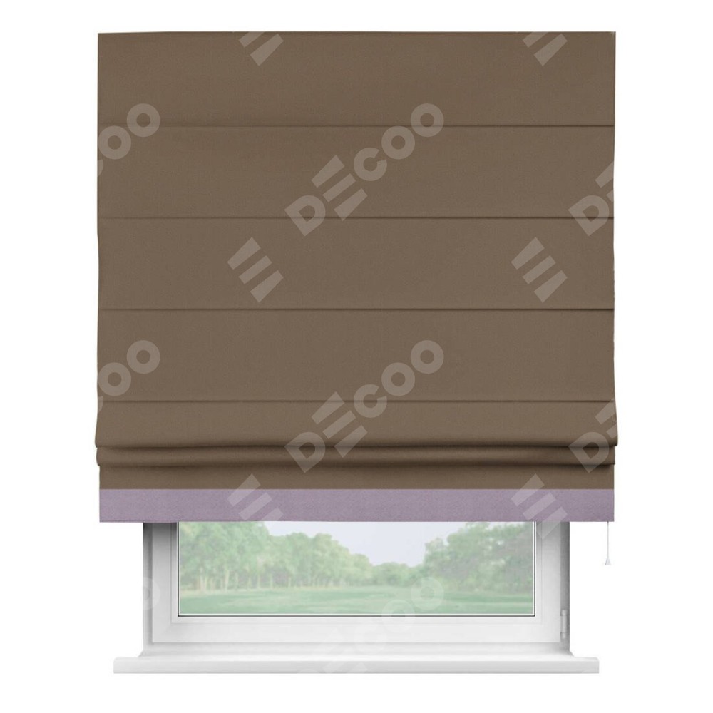 Римская штора производителя «Cortin», используется для проёма, пошита из ткани блэкаут однотонный коричневый, артикул ткани 91334. Отделка шторы кантом «Джестер», ткань для канта используется из блэкаута однотонного разной расцветки на выбор. Имеет универсальный механизм и подходит для монтажа: на потолок, на стену и в нишу.