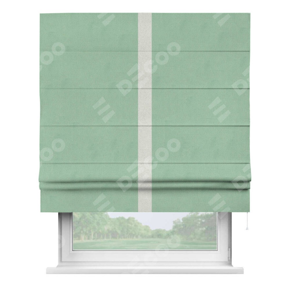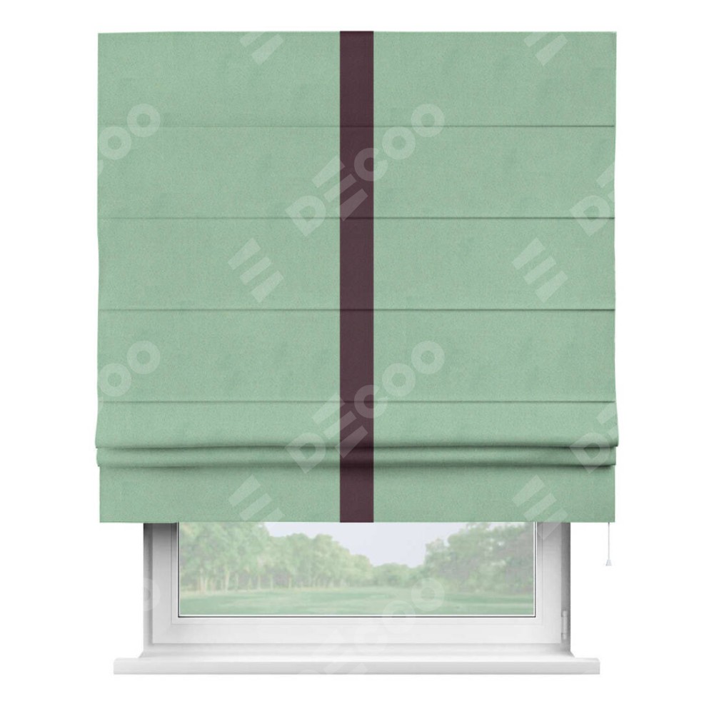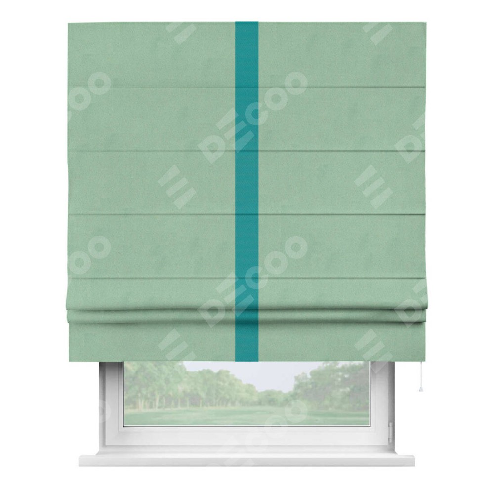 Римская штора производителя «Cortin», используется для проёма, пошита из ткани блэкаут однотонный ментоловый, артикул ткани 91572−1. Отделка шторы кантом «Хайвей», ткань для канта используется из блэкаута однотонного разной расцветки на выбор. Имеет универсальный механизм и подходит для монтажа: на потолок, на стену и в нишу.