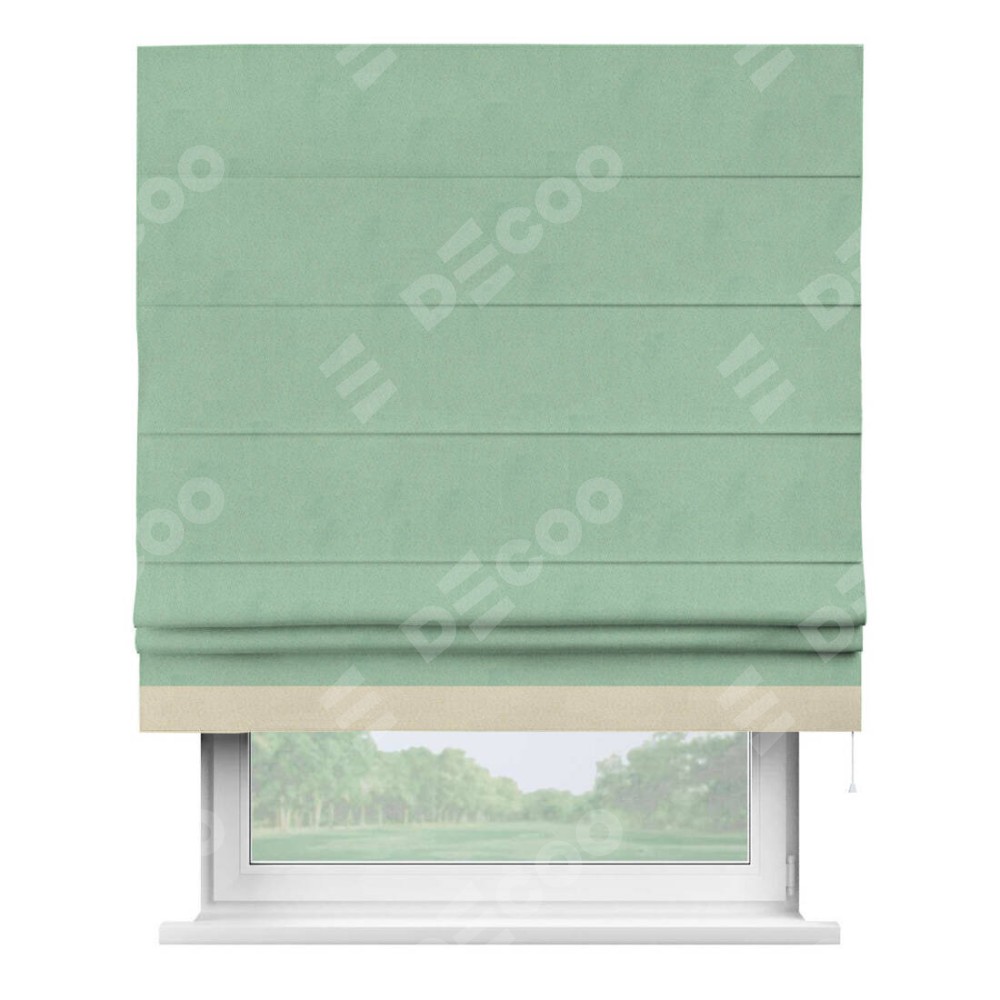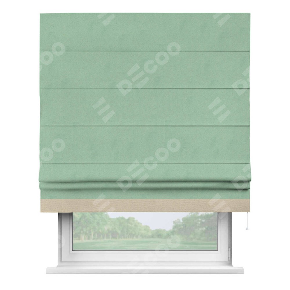 Римская штора производителя «Cortin», используется для проёма, пошита из ткани блэкаут однотонный ментоловый, артикул ткани 91572−1. Отделка шторы кантом «Джестер», ткань для канта используется из блэкаута однотонного разной расцветки на выбор. Имеет универсальный механизм и подходит для монтажа: на потолок, на стену и в нишу.