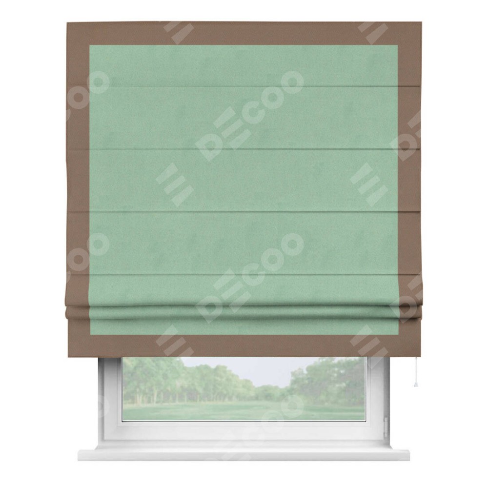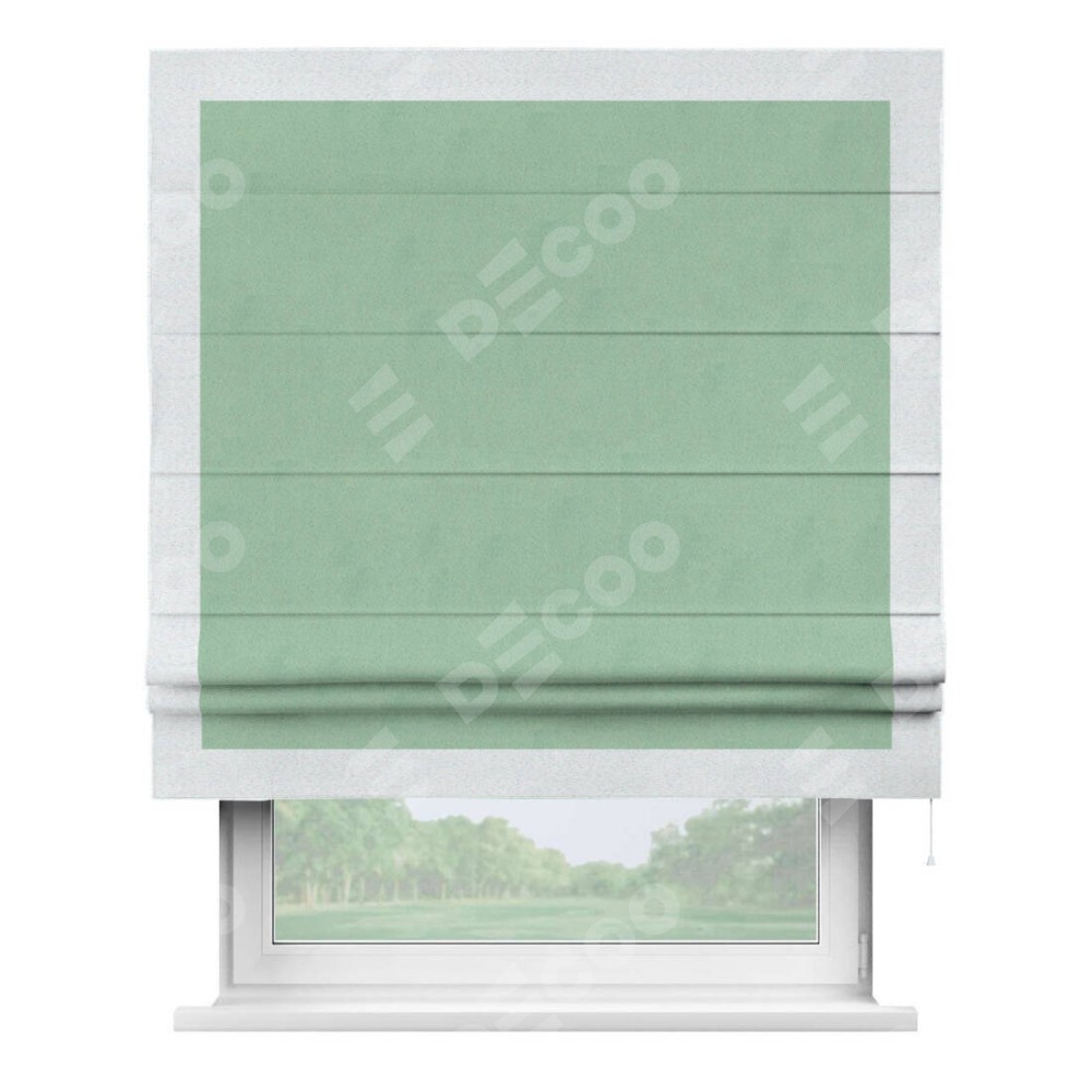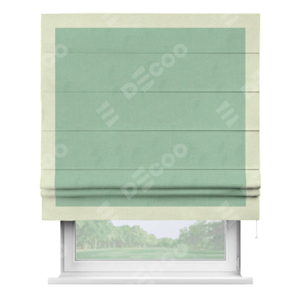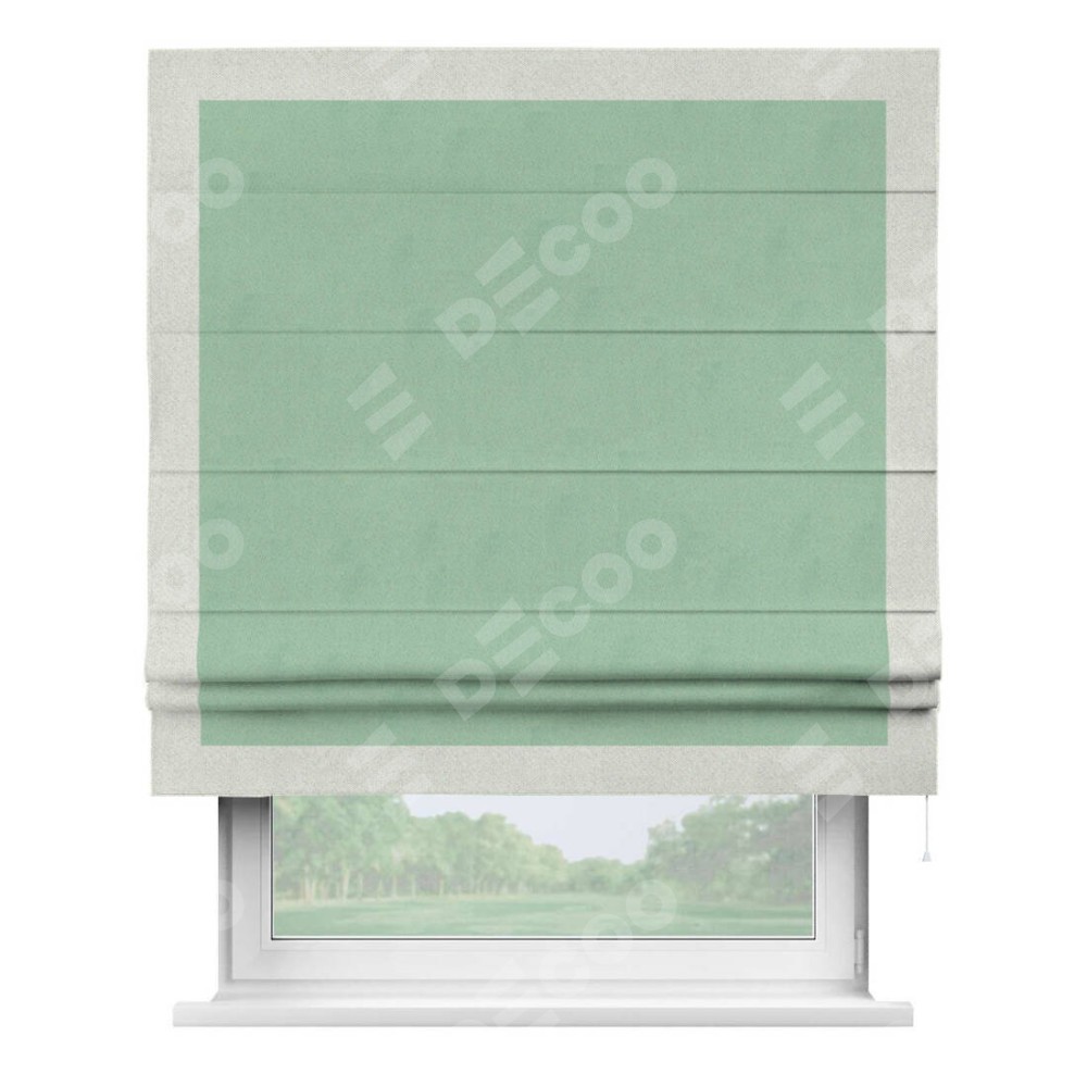 Римская штора производителя «Cortin», используется для проёма, пошита из ткани блэкаут однотонный ментоловый, артикул ткани 91572−1. Отделка шторы кантом «Чесс», ткань для канта используется из блэкаута однотонного разной расцветки на выбор. Имеет универсальный механизм и подходит для монтажа: на потолок, на стену и в нишу.