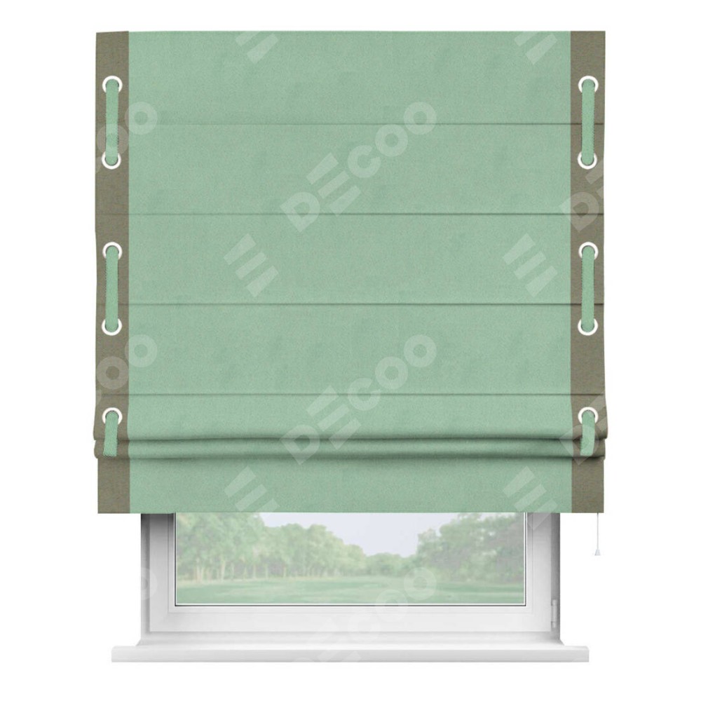 Римская штора производителя «Cortin», используется для проёма, пошита из ткани блэкаут однотонный ментоловый, артикул ткани 91572−1. Отделка шторы кантом «Стрим Дуо» на кантах расположены люверсы с пояском, ткань для канта используется из блэкаута однотонного разной расцветки на выбор. Ткань для пояска обычно используется из основной ткани шторы, а так же можно сделать из любой расцветки по желанию. Имеет универсальный механизм и подходит для монтажа: на потолок, на стену и в нишу.