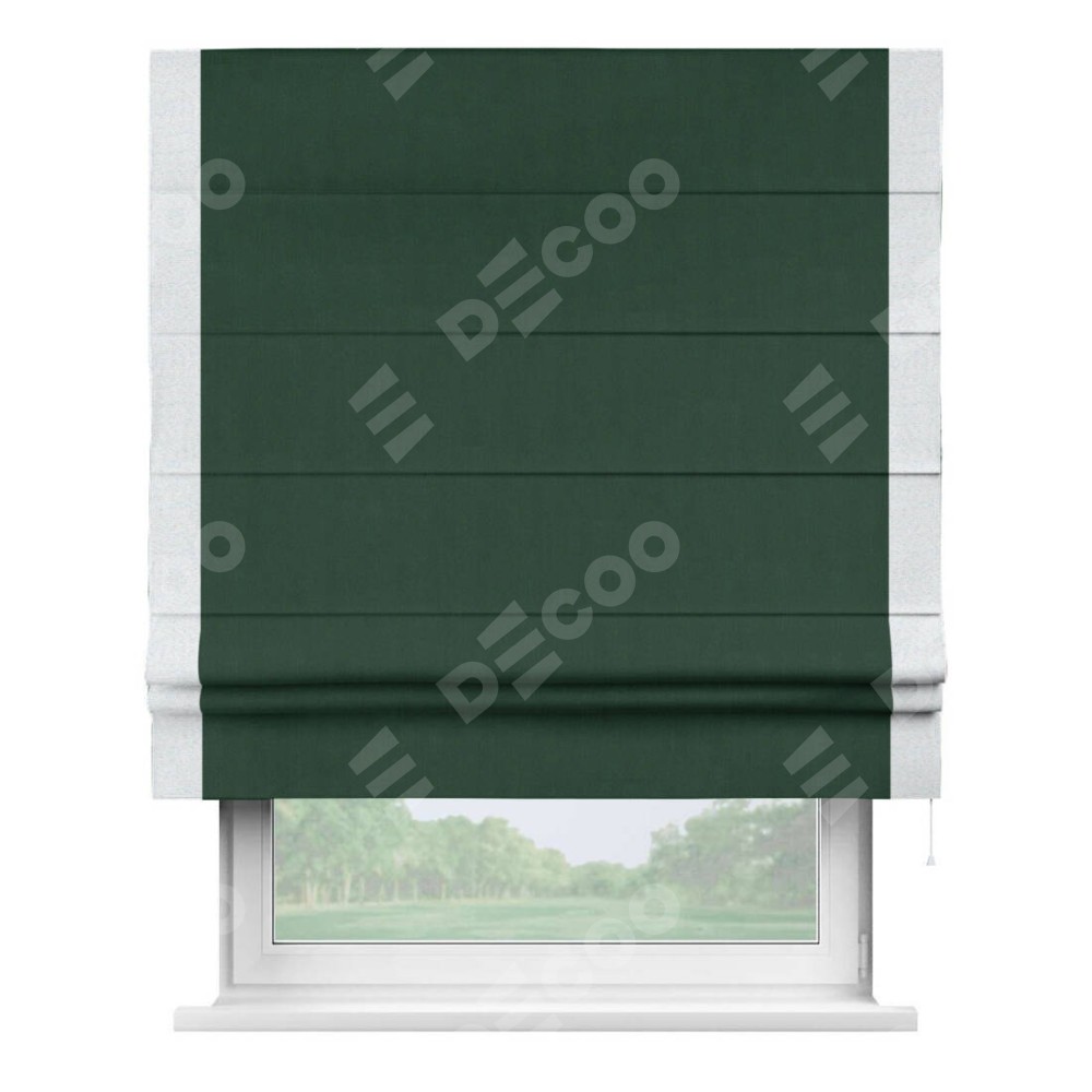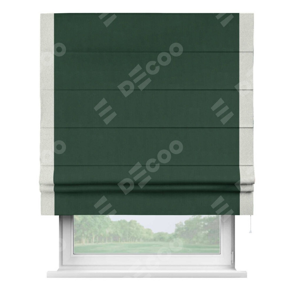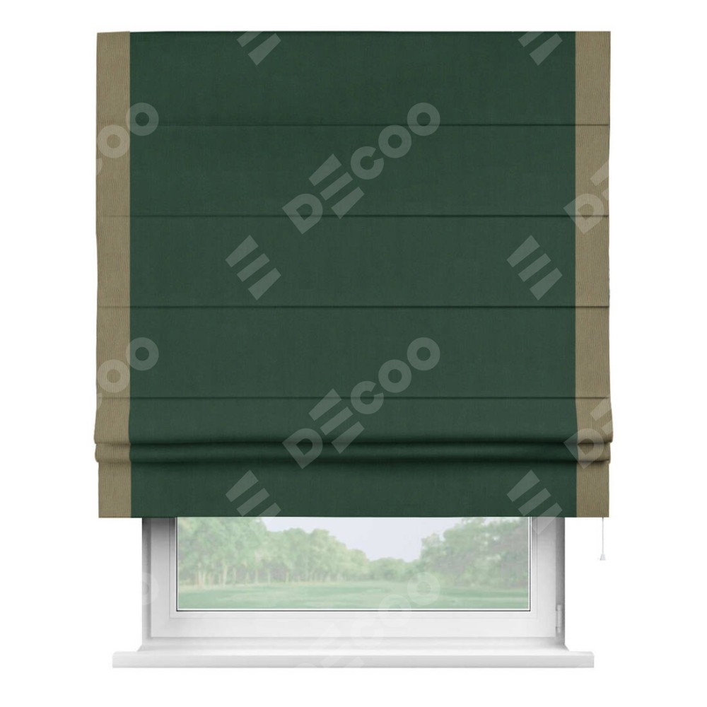 Римская штора производителя «Cortin», используется для проёма, пошита из ткани блэкаут однотонный зелёный, артикул ткани 91572−2. Отделка шторы кантом «Стрим Дуо», ткань для канта используется из блэкаута однотонного разной расцветки на выбор. Имеет универсальный механизм и подходит для монтажа: на потолок, на стену и в нишу.