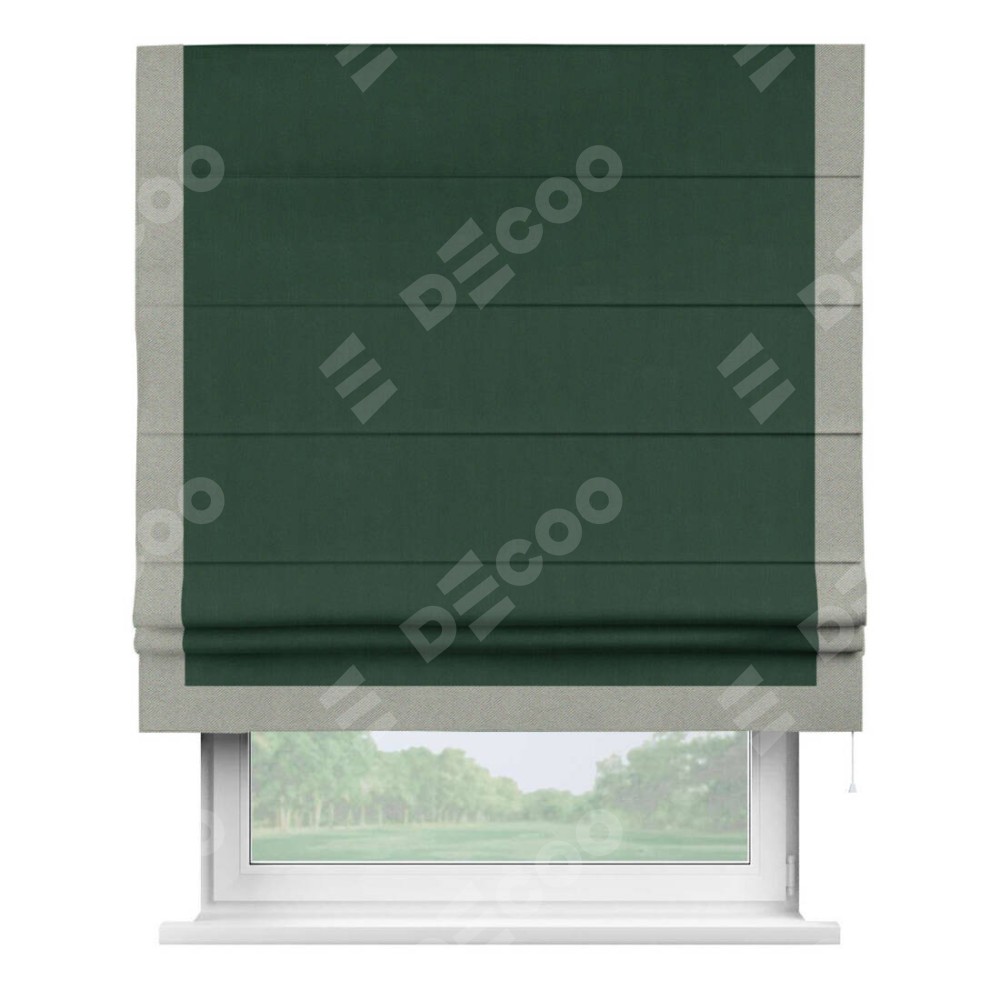 Римская штора производителя «Cortin», используется для проёма, пошита из ткани блэкаут однотонный зелёный, артикул ткани 91572−2. Отделка шторы кантом «Виктория», ткань для канта используется из блэкаута однотонного разной расцветки на выбор. Имеет универсальный механизм и подходит для монтажа: на потолок, на стену и в нишу.