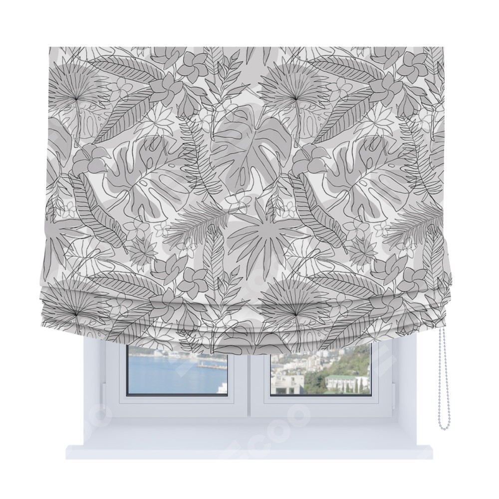 Римская штора Soft производителя «Cortin», используется для проёма, пошита из ткани блэкаут с нанесением сублимационной печати «Тропический лес». Имеет универсальный механизм и подходит для монтажа: на потолок, на стену и в нишу. В отличие от стандартных римских штор, римская штора Soft не имеет горизонтальных вставок и нижнего отвеса. Это позволяет ткани произвольно драпироваться в свободные мягкие складки.