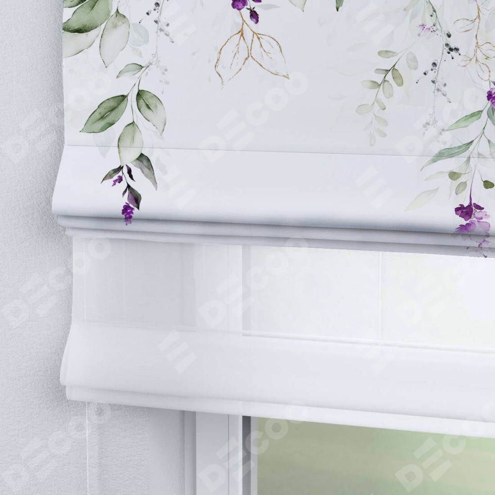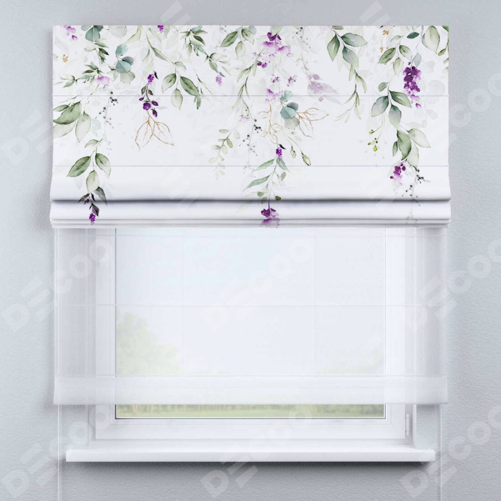 Двойная римская штора «День-ночь» от производителя Cortin предназначена для использования в проёмах. Эта штора уникальна тем, что состоит из двух полотен. На лицевой стороне находится блэкаут с нанесением сублимационной печати «Цветочный водопад», обеспечивающий эффективное затемнение. В комплект также входит вторая ткань — легкий белый тюль (артикул: V-01), который добавляет изящества и легкости оформлению окна. Кроме того, доступны и другие разновидности ткани тюль, выбор которых доступен по ссылке .