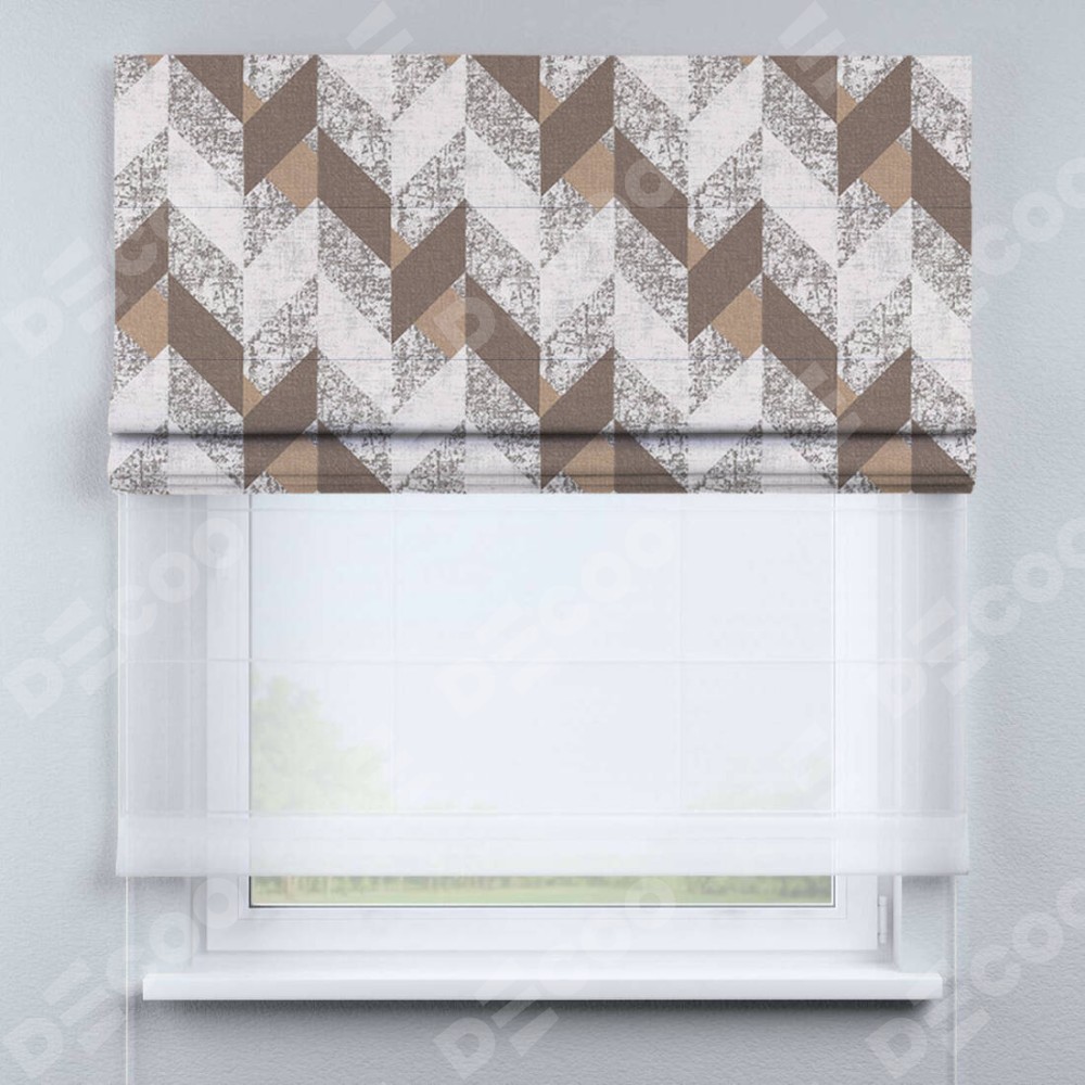Двойная римская штора «День-ночь» от производителя Cortin предназначена для использования в проёмах. Эта штора уникальна тем, что состоит из двух полотен. На лицевой стороне находится блэкаут с нанесением сублимационной печати «Шеврон Либерти», обеспечивающий эффективное затемнение. В комплект также входит вторая ткань — легкий белый тюль (артикул: V-01), который добавляет изящества и легкости оформлению окна. Кроме того, доступны и другие разновидности ткани тюль, выбор которых доступен по ссылке .