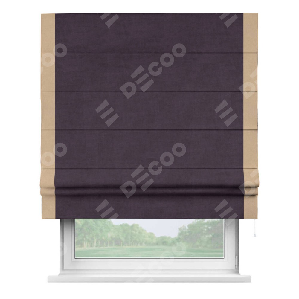 Римская штора производителя «Cortin», используется для проёма, пошита из ткани вельвет тёмно-фиолетовый, артикул ткани 72403. Отделка шторы кантом «Стрим Дуо», ткань для канта используется из вельвета разной расцветки на выбор. Имеет универсальный механизм и подходит для монтажа: на потолок, на стену и в нишу.