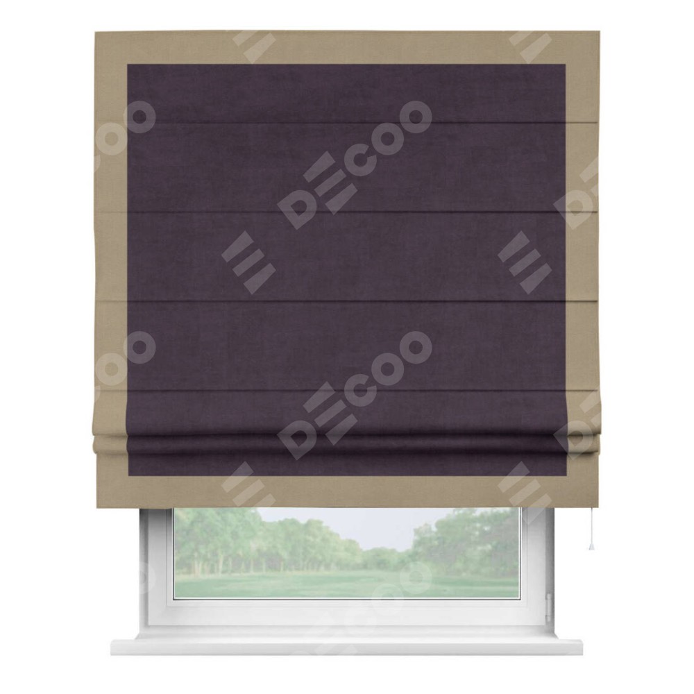 Римская штора производителя «Cortin», используется для проёма, пошита из ткани вельвет тёмно-фиолетовый, артикул ткани 72403. Отделка шторы кантом «Чесс», ткань для канта используется из вельвета разной расцветки на выбор. Имеет универсальный механизм и подходит для монтажа: на потолок, на стену и в нишу.