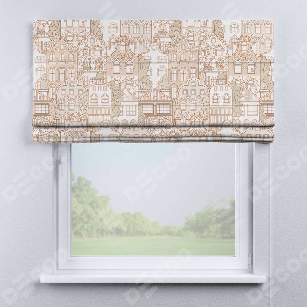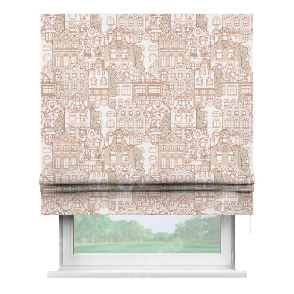 Классическая римская штора производителя «Cortin», пошита из ткани блэкаут с нанесением сублимационной печати «Милый городок». Имеет универсальный механизм и подходит для монтажа: на потолок, на стену и в нишу.