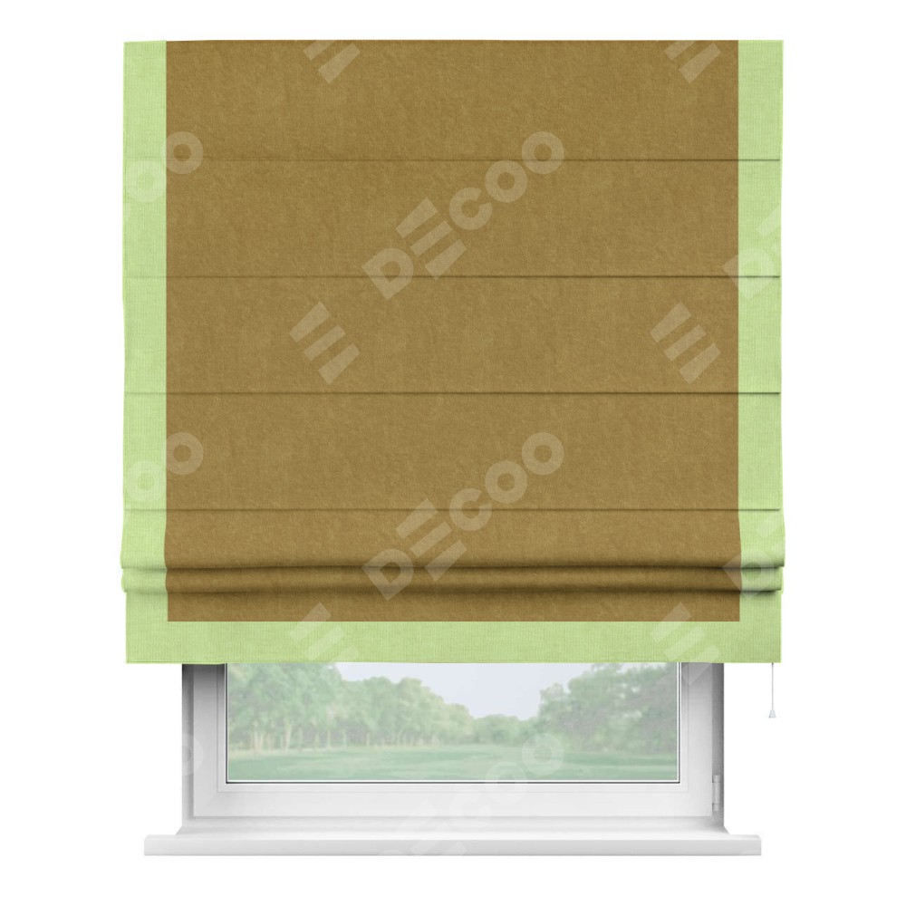 Римская штора производителя «Cortin», используется для проёма, пошита из ткани канвас горчица, артикул ткани v-476. Отделка шторы кантом «Виктория» (липовый v-207), ткань для канта используется из канваса разной расцветки на выбор. Имеет универсальный механизм и подходит для монтажа: на потолок, на стену и в нишу.