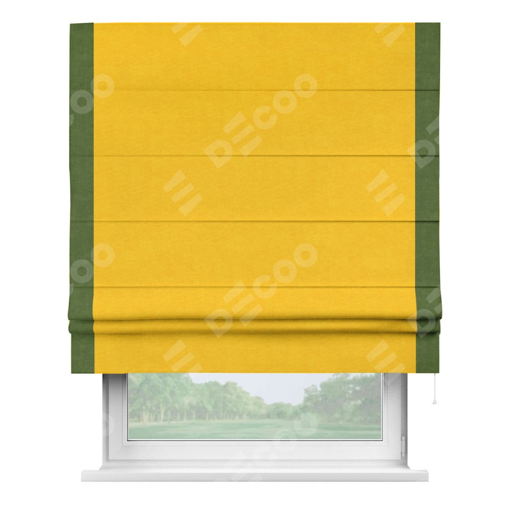 Римская штора производителя «Cortin», используется для проёма, пошита из ткани канвас желтый, артикул ткани v-344. Отделка шторы кантом «Стрим Дуо» (трава v-473), ткань для канта используется из канваса разной расцветки на выбор. Имеет универсальный механизм и подходит для монтажа: на потолок, на стену и в нишу.