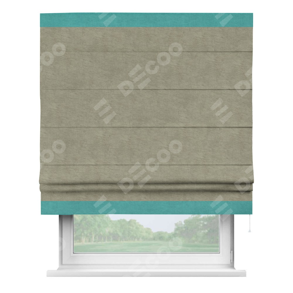 Римская штора производителя «Cortin», используется для проёма, пошита из ткани канвас капучино, артикул ткани v-211. Отделка шторы кантом «Горизонт» (бирюзовый v-1048), ткань для канта используется из канваса разной расцветки на выбор. Имеет универсальный механизм и подходит для монтажа: на потолок, на стену и в нишу.