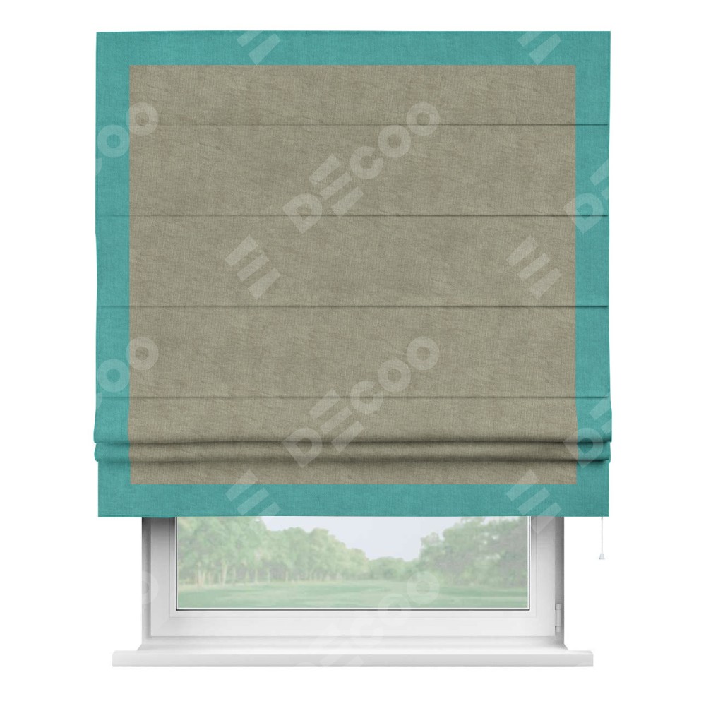 Римская штора производителя «Cortin», используется для проёма, пошита из ткани канвас капучино, артикул ткани v-211. Отделка шторы кантом «Чесс» (бирюзовый v-1048), ткань для канта используется из канваса разной расцветки на выбор. Имеет универсальный механизм и подходит для монтажа: на потолок, на стену и в нишу.