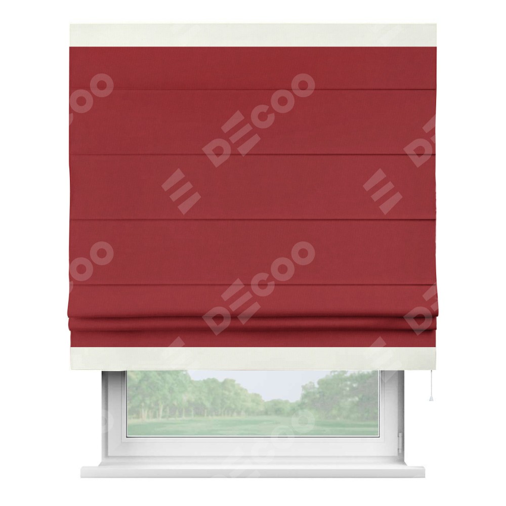 Римская штора производителя «Cortin», используется для проёма, пошита из ткани канвас красный, артикул ткани v-113. Отделка шторы кантом «Горизонт» (молочный v-93), ткань для канта используется из канваса разной расцветки на выбор. Имеет универсальный механизм и подходит для монтажа: на потолок, на стену и в нишу.