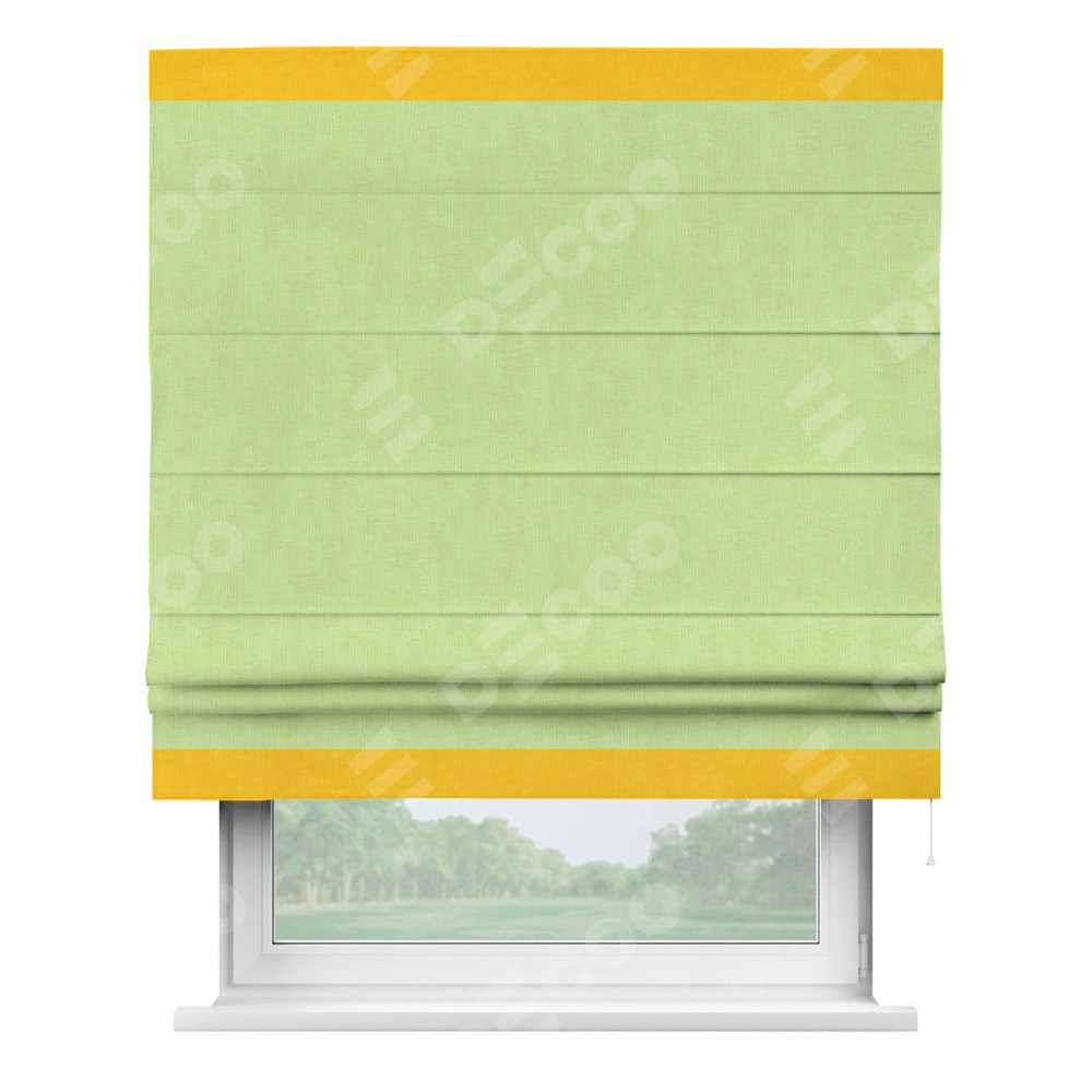 Римская штора производителя «Cortin», используется для проёма, пошита из ткани канвас липовый, артикул ткани v-207. Отделка шторы кантом «Горизонт» (желтый v-344), ткань для канта используется из канваса разной расцветки на выбор. Имеет универсальный механизм и подходит для монтажа: на потолок, на стену и в нишу.
