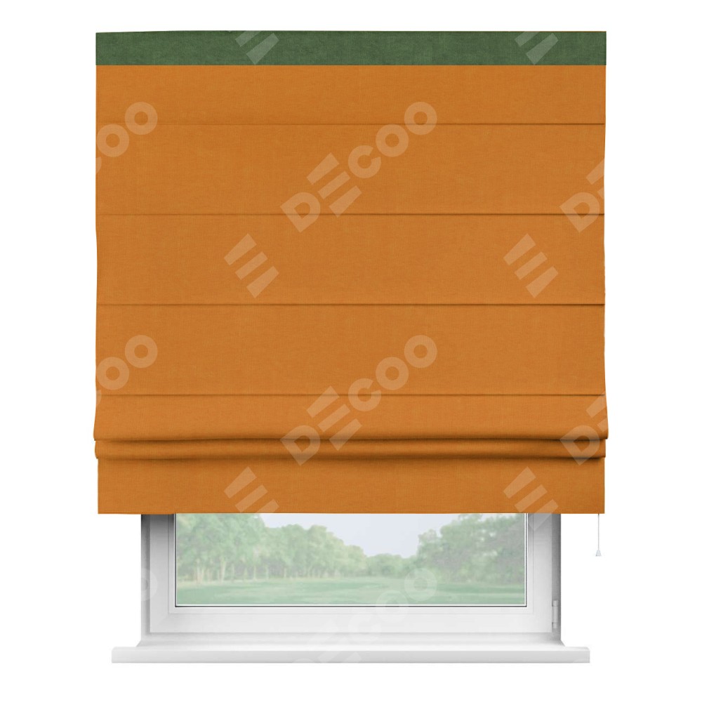 Римская штора производителя «Cortin», используется для проёма, пошита из ткани канвас оранжевый, артикул ткани v-106. Отделка шторы кантом «Кинг» (зелёный v-16), ткань для канта используется из канваса разной расцветки на выбор. Имеет универсальный механизм и подходит для монтажа: на потолок, на стену и в нишу.