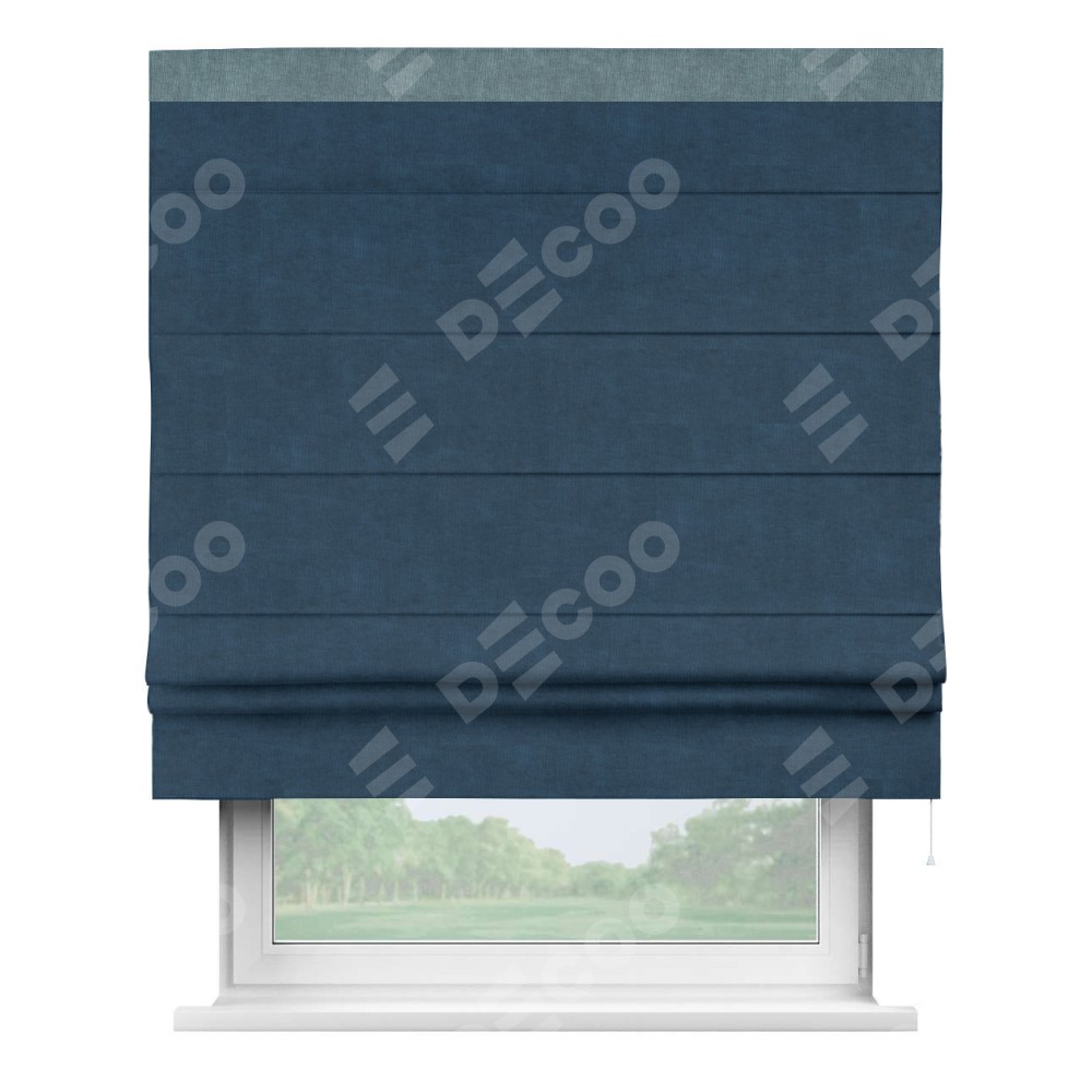 Римская штора производителя «Cortin», используется для проёма, пошита из ткани канвас синий, артикул ткани v-573. Отделка шторы кантом «Кинг» (серо-голубой v-330), ткань для канта используется из канваса разной расцветки на выбор. Имеет универсальный механизм и подходит для монтажа: на потолок, на стену и в нишу.