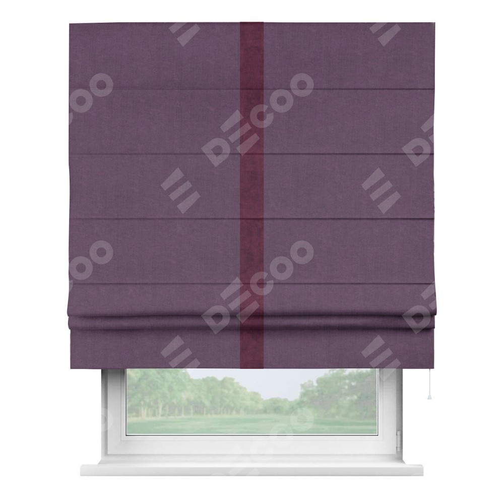 Римская штора производителя «Cortin», используется для проёма, пошита из ткани канвас сиреневый, артикул ткани v-98. Отделка шторы кантом «Хайвей» (фиолетовый v-99), ткань для канта используется из канваса разной расцветки на выбор. Имеет универсальный механизм и подходит для монтажа: на потолок, на стену и в нишу.