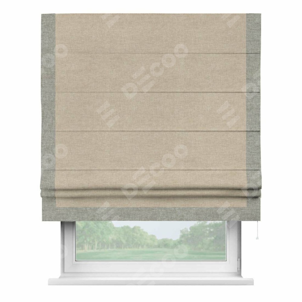 Римская штора производителя «Cortin», используется для проёма, пошита из ткани лён кашемир бежевый, артикул 17206. Отделка шторы кантом «Виктория», ткань для канта используется из льна разной расцветки на выбор. Имеет универсальный механизм и подходит для монтажа: на потолок, на стену и в нишу.