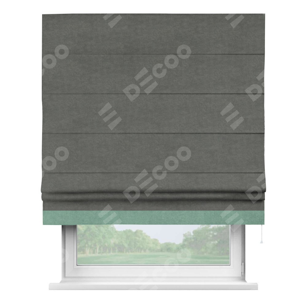 Римская штора производителя «Cortin», используется для проёма, пошита из ткани канвас тёмно-серый, артикул ткани v-340. Отделка шторы кантом «Джестер» (мятный v-248), ткань для канта используется из канваса разной расцветки на выбор. Имеет универсальный механизм и подходит для монтажа: на потолок, на стену и в нишу.