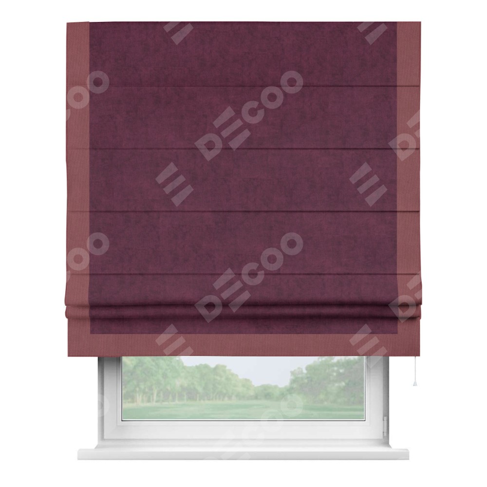 Римская штора производителя «Cortin», используется для проёма, пошита из ткани канвас фиолетовый, артикул ткани v-99. Отделка шторы кантом «Виктория» (ягодный v-28), ткань для канта используется из канваса разной расцветки на выбор. Имеет универсальный механизм и подходит для монтажа: на потолок, на стену и в нишу.
