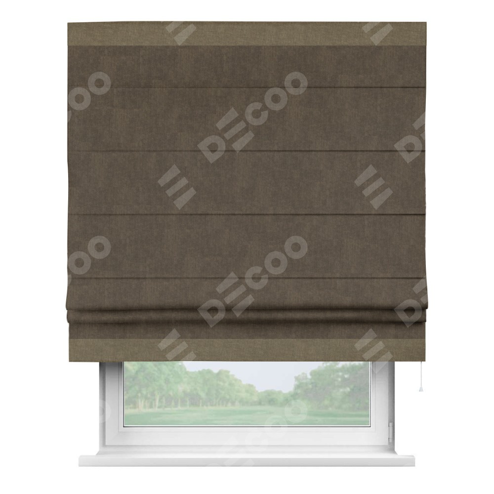 Римская штора производителя «Cortin», используется для проёма, пошита из ткани канвас шоколадный, артикул ткани v-193. Отделка шторы кантом «Горизонт» (молочный шоколад v-08), ткань для канта используется из канваса разной расцветки на выбор. Имеет универсальный механизм и подходит для монтажа: на потолок, на стену и в нишу.