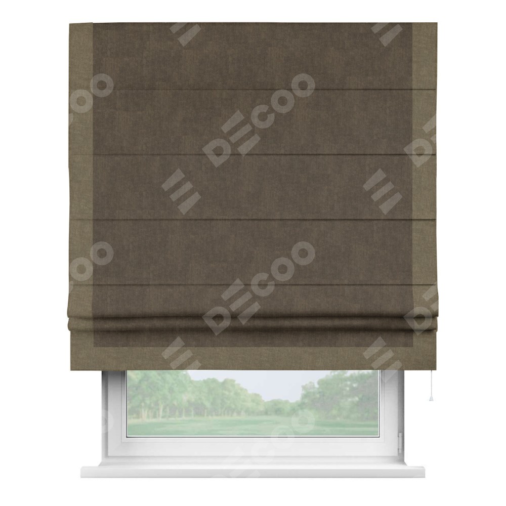 Римская штора производителя «Cortin», используется для проёма, пошита из ткани канвас шоколадный, артикул ткани v-193. Отделка шторы кантом «Виктория» (молочный шоколад v-08), ткань для канта используется из канваса разной расцветки на выбор. Имеет универсальный механизм и подходит для монтажа: на потолок, на стену и в нишу.