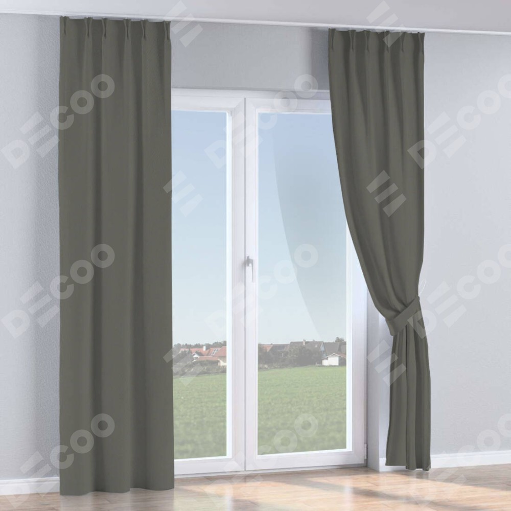 Комплект прямых штор, от производителя «Cortin», пошиты из ткани блэкаут однотонный тёмно-серый, артикул ткани 91570. С изнаночной стороны в верхней части штор пристрачивается шторная лента с декоративными складками «Кустик». Для создания элегантных складок прямые шторы шьются по стандарту с коэффициентом 1:2 (на 100 см. ширины проёма 200 см. ширины ткани).