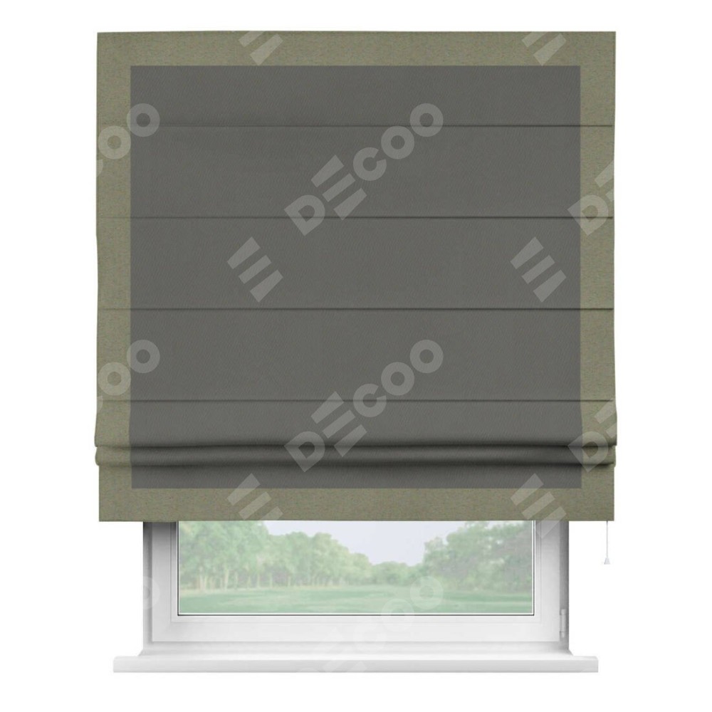 Римская штора производителя «Cortin», используется для проёма, пошита из ткани блэкаут однотонный тёмно-серый, артикул ткани 91570. Отделка шторы кантом «Чесс», ткань для канта используется из блэкаута однотонного разной расцветки на выбор. Имеет универсальный механизм и подходит для монтажа: на потолок, на стену и в нишу.
