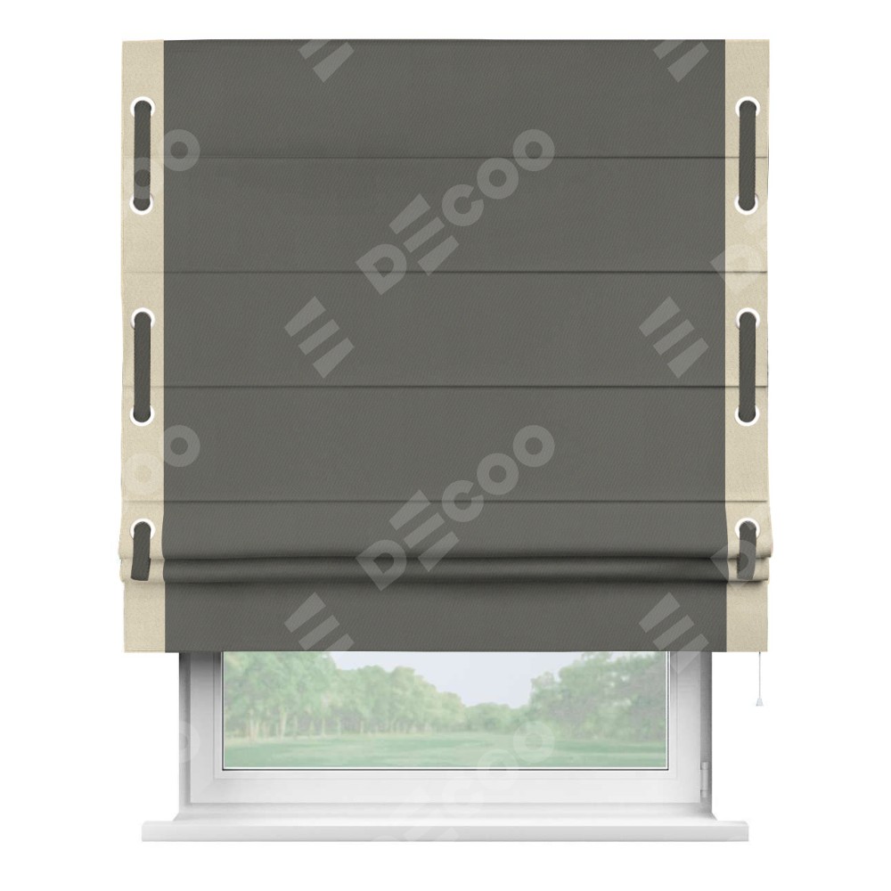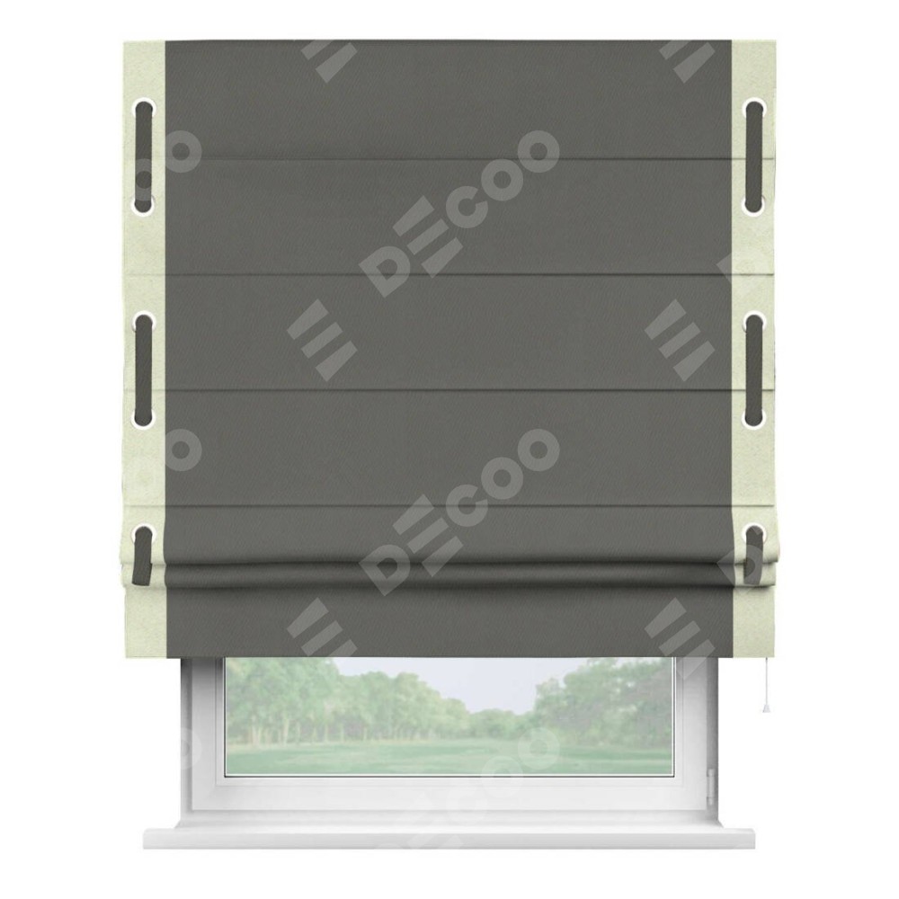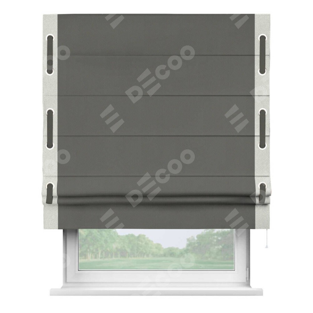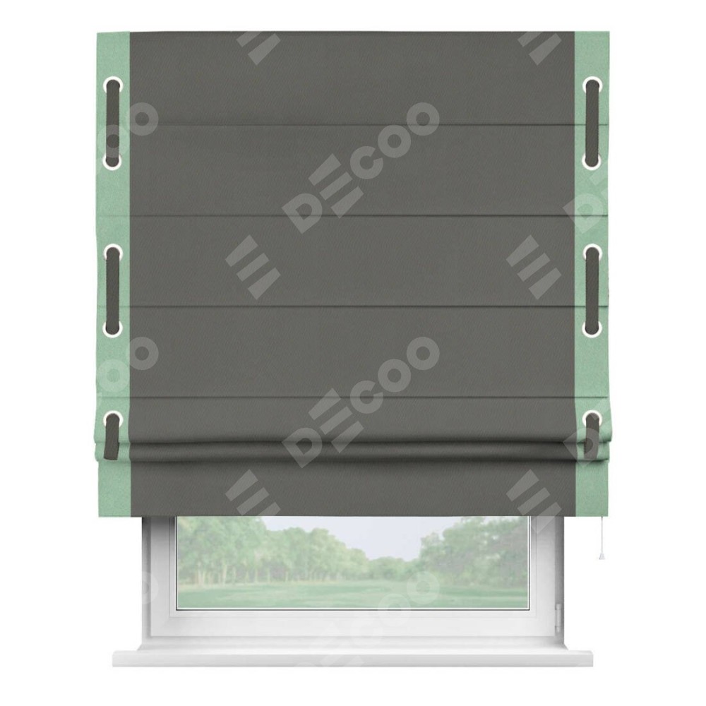Римская штора производителя «Cortin», используется для проёма, пошита из ткани блэкаут однотонный тёмно-серый, артикул ткани 91570. Отделка шторы кантом «Стрим Дуо» на кантах расположены люверсы с пояском, ткань для канта используется из блэкаута однотонного разной расцветки на выбор. Ткань для пояска обычно используется из основной ткани шторы, а так же можно сделать из любой расцветки по желанию. Имеет универсальный механизм и подходит для монтажа: на потолок, на стену и в нишу.